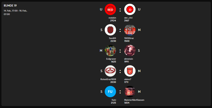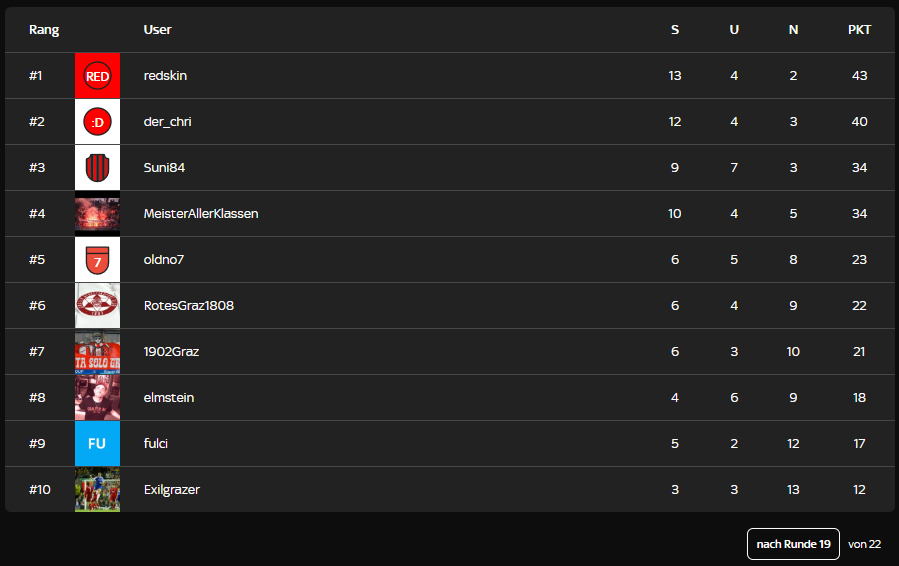 ASB GAK Champions League - Runde 19 ist ausgewertet! Im Gipfeltreffen kann @redskin in der Nachspielzeit den Ausgleich meine Elf erzielen. Beide Mannschaften geben alles, mit Zukic, Stojanovic und Weissmann konnten gleich 3 Spieler über 500 Punkte erzielen. Beinahe wäre es aufgrund von Fanausschreitungen zu einem Spielabbruch gekommen, da beide Fans sich über die Leistung der Trainer massiv erzürnten. So hat @redskin seinen Spielmacher Schöpf geschont, der über 400 Punkte beisteuern hätte können. Auf der anderen Seite sind die Anhänger wütend, dass der Coach nicht mehr aus dem vorhandenen Spielermaterial macht und Ranftl, der mit 337 Punkten das Spiel locker entschieden hätte, kurzfristig auf die Bank verbannt hat und dafür ausgerechnet Bajic auflaufen lässt, der mit einem Handselfer kur vor Abpfiff wertvolle Punkte herschenkt. Die restlichen vier Spiele bringen jeweils Sieger: @Suni setzt sich locker gegen @1 9 0 2 Graz durch, @elmstein nimmt auswärts drei Punkte beim Schlusslicht @Exilgrazer mit, @elma gewinnt knapp gegen @oldno7 und @fulci schafft einen wichtigen Sieg gegen den höher eingeschätzten @MeisterAllerKlassen. In der Tabelle kann @redskin seinen Vorsprung halten, @Suni überholt @MeisterAllerKlassen und klettert auf Rang 3 während @Exilgrazer bereits abgeschlagen am letzten Tabellenplatz festgenagelt scheint. Was den zweiten Abstiegsplatz angeht ist jedenfalls alles offen, hier bahnt sich zwischen Rang 5 und 9 noch ein harter Kampf an. Am Transfersektor gab es wenig nennenswerte Aktivitäten, der Markt scheint ziemlich abgegrast: Ahoussou soll um 2.8M€ die indiskutable Abwehrleistung von Schlusslicht @Exilgrazer verbessern, @Suni schnappt sich den braven Rossdorfer um 1.8M€ und Joker Hristic für 800k€, Edelreservist Trummer geht um 2.2M€ zu @MeisterAllerKlassen @elma verpflichtet Zweitligastar Grosse um 4.6M€ und mit Kreuzriegler um 1.3M€ einen Spieler mit Erfahrung aus der norwegischen 2. Liga, was bei den Fans durchaus kritisch beäugt wird. Bei mir dockt der vielgescholtene Hedl um 4M€ als Ersatzgoalie an. -