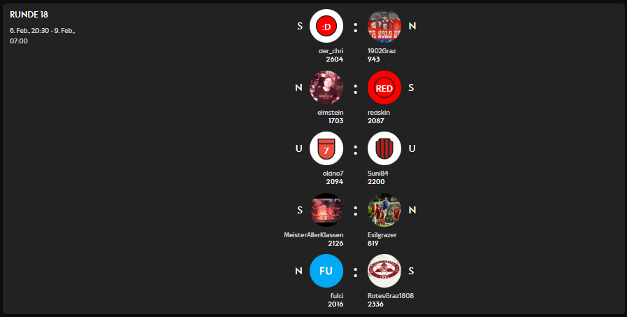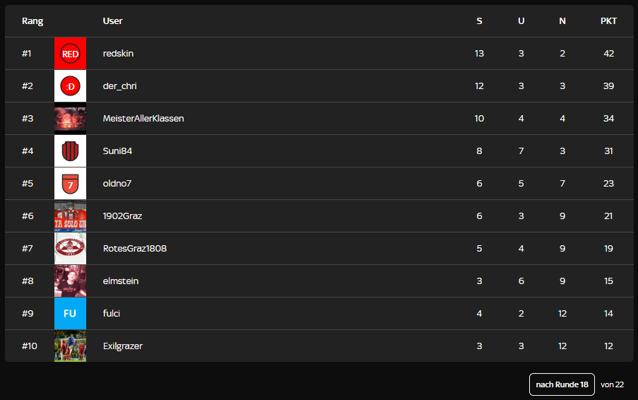 ASB GAK Champions League - Runde 18 ist ausgewertet! Ich setze mich mit dem Rundenhighscore gegen ein desaströses Team von @1 9 0 2 Graz durch, Tabellenführer @redskin erlangt einen für seine Verhältnisse hochdramatischen Auswärtssieg bei @elmstein, zu erwähnen ist jedenfalls das das auch zu zehnt gelingt nachdem Schöpf kurzfristig ausfällt. @Suni muss sich gegen @oldno7 mit einem Unentschieden begnügen, @MeisterAllerKlassen hingegen kommt zu einem spektakulären Sieg gegen die vollkommen harmlos auftretende Mannschaft von @Exilgrazer. Den knappsten Sieg der Runde kann @elma bei @fulci angeführt von Harakaté erringen. Hier ist die Tabelle nach Runde 18: Kaum nennenswerte Veränderungen, lediglich @elma macht einen wichtigen Sprung aus der Abstiegszone. Bei den Wintertransfers gab es folgende Highlights: Mit Nwaiwu, Chukwuani, Baier, Ratkov, Horvat, Rasmussen und Oermann haben einige Leistungsträger die Liga verlassen, dadurch hat sich einiges an Budget freigesetzt: @elma schnappt sich die drei Neo-Grazer Grosse um 4.6 M€, Stolz um 3.6M€ sowie Mamageishvili um 3.4M€, Tornich wechselte um 3.8M€ ins Team von @redskin, @Suni verpflichtet Fosso um 3.5M€, Krätzig geht um 3.2M€ zu @MeisterAllerKlassen und bei mir schlugen Kjaergaard um 6.6M€ sowie Gazibegovic um 7.5M€ auf. Hier noch eine Gegenüberstellung der Marktwerte gegenüber dem Stand vom 12.01.2026. Stand 11.02.2026 haben die Teams jeweils (folgende Kaderwerte): 97.2M€ (86.8 M€) @doncerebro 63.0M€ (57.9 M€) @redskin 54.3M€ (52.1 M€) @fulci 49.4M€ (46.5 M€) @Suni 46.4M€ (42.4 M€) @elma 41.0M€ (38.3 M€) @oldno7 37.7M€ (39.1 M€) @MeisterAllerKlassen 37.4M€ (37.9 M€) @Exilgrazer 35.7M€ (36.1 M€) @elmstein 35.0M€ (37.5 M€) @1 9 0 2 Graz Auffallend ist, das mit @fulci und @elma zwei Abstiegskandidaten beim Kaderwert weiterhin in der ersten Hälfte der Tabelle stehen. Beim ein oder anderen Team werden wohl noch ein paar Melonen auf der Bank geparkt sein, die mangels namhafter Neuverpflichtungen am Deadline-Day wohl auch nicht mehr in großartig verwertbares Spielermaterial investiert werden können. -