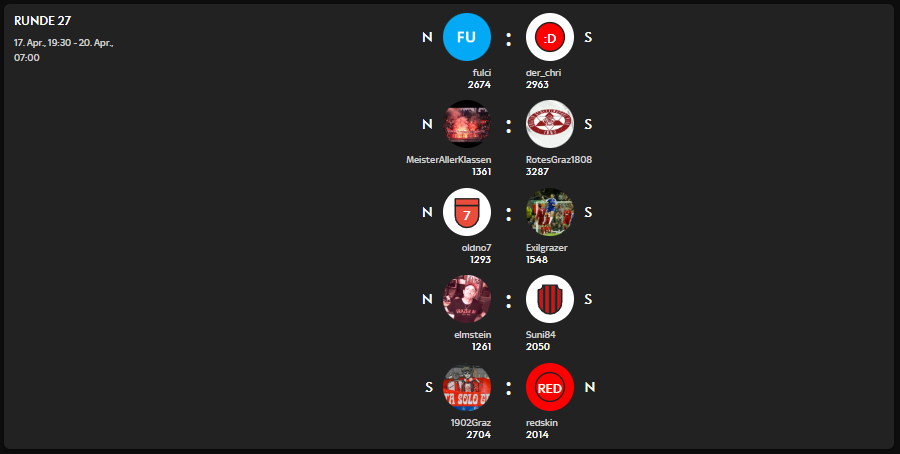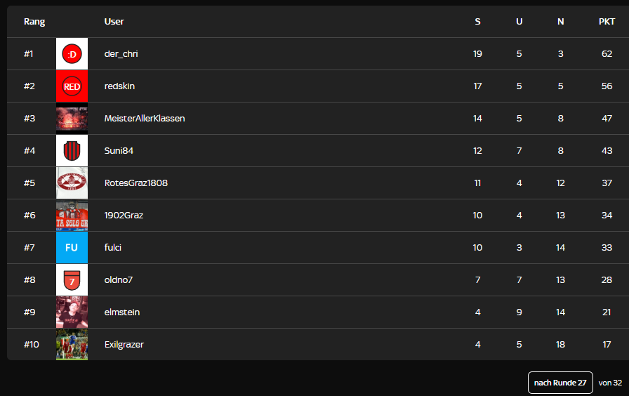 ASB GAK Champions League - Runde 27 ist ausgewertet! Der Rundenhighscore geht an @elma, der auf stolze 3287 Punkte kommt, bei einer starken Mannschaftsleistung stechen Boras und Bolla noch heraus. @MeisterAllerKlassen kommt aus dem Staunen nicht heraus und vergisst dabei völlig, Gegenwehr zu leisten. Dieser Wert ist der zweitbeste seit Aufzeichnung der Messdaten! Hier die Top10: 1. 3690 Ich Runde 13 2. 3287 @elma Runde 27 3. 3187 Ich Runde 19 4. 3138 @redskin Runde 14 5. 2963 Ich Runde 27 6. 2957 @fulci Runde 26 7. 2935 @redskin Runde 13 8. 2924 @redskin Runde 19 9. 2789 Ich Runde 11 10. 2752 @redskin Runde 21 Der Ausgleich von Kapitän Kalajdzic (516 Punkte, 4 der letzten 5 Runden hat er unglaublich stark performt) hat Spannung bis zur Schlusssekunde garantiert, dennoch kann ich einen hauchdünnen Erfolg gegen @fulci feiern. Auch nur mit 10 Mann feiert @1 9 0 2 Graz einen deutlichen Sieg gegen @redskin. Cvetkos Fehlen haben die Mannschaftskollegen mehr als wettgemacht. Kellerkind @Exilgrazer verschiebt die Abstiegsparty mit einem knappen Sieg gegen @oldno7, Gratulation zum ersten Sieg seit Runde 16! Bei @elmstein drohen nach der deutlichen Niederlage gegen @Suni auch bereits die Lichter in naher Zukunft auszugehen, auf Alajbegovic ist Runde für Runde Verlass. Dank der Niederlage von @redskin habe ich aktuell 6 Punkte Vorsprung, dennoch bleibt das Rennen um den Titel spannend. @Exilgrazer hat nun 11 Punkte Rückstand auf das rettende Ufer, bei 15 zu vergebenden Punkten ist die mathematische Möglichkeit noch gegeben. -