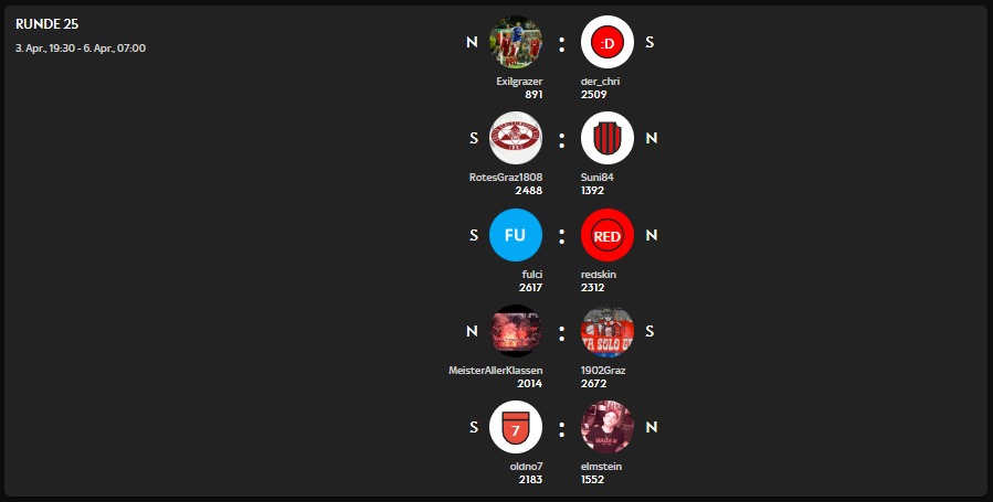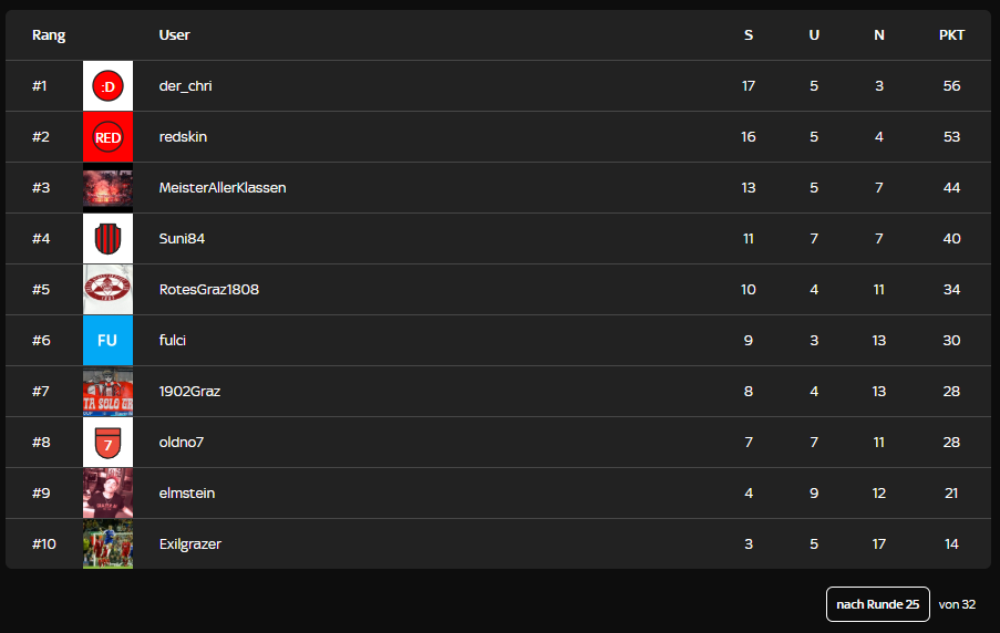 ASB GAK Champions League - Runde 25 ist ausgewertet! Nach einem knappen Erfolg letzte Runde muss Spitzenreiter @redskin dieses Mal eine knappe Niederlage gegen @fulci einstecken. Auch das Duell der Torjäger geht knapp mit 436 zu 420 Punkten für Kalajdzic gegen Konaté aus. Die meisten Punkte diese Runde macht @1 9 0 2 Graz, alleine Mutandwa und Bogarde tragen 1000 Punkte bei zum sicheren Erfolg gegen @MeisterAllerKlassen. @elma feiert einen Kantersieg gegen @Suni, das Sturmduo Harkaté und Hofleitner ist einfach in Topform. Cissé und Müller treiben mit knapp 1000 Punkten @oldno7 zu einem sicheren Sieg gegen @elmstein Ich schlage Tabellenschlusslicht @Exilgrazer dank starker Leistungen von Andrade und Horvath, die auch knapp 1000 Punkte erzielen, da fallen auch die -200 Punkte von Stojanovic nicht ins Gewicht. In der Tabelle kommt es somit zum Führungswechsel, ich setze mich nun vor @redskin an die Spitze. Während es oben nach einem spannendem Duell um den Titel aussieht, scheint der Kampf um den Abstieg nun auch für @elmstein schon ein hartes Stück Arbeit zu werden, dank toller Leistungen der Mittelständler @oldno7, @1 9 0 2 Graz, @fulci & @elma ist der Rückstand nun bereits auf 7 Punkte angewachsen. -