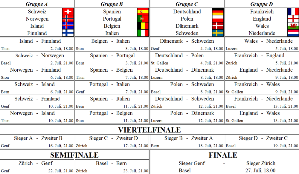 Ab 2029 sind von der UEFA ganz klar gefordert: minimum 1 Stadion mit 50.000, mindestens drei mit 30.000 und mindestens vier mit 20.000 Kapazität. In Österreich geht sich das eh schon nimmer aus. Hier noch die detaillierten Team-Vorstellungen Alle 16 Teams: https://ballverliebt.eu/2025/07/02/teilnehmer-frauen-euro-2025-schweiz/ Und auch in einzeln: Gruppe A: https://ballverliebt.substack.com/p/betet-freie-schweizer-betet-die-gruppe Gruppe B: https://ballverliebt.substack.com/p/der-koniginnen-marsch-die-gruppe Gruppe C: https://ballverliebt.substack.com/p/auf-alten-erinnerungen-thronend-die Gruupe D: https://ballverliebt.substack.com/p/der-tag-des-ruhmes-ist-gekommen-die