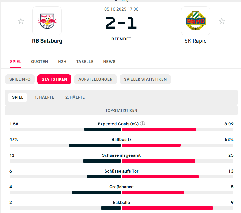 Ich bin gespannt was dieses Spiel mit der Mannschaft macht. Gegen den LASK wissen wir dann schon mehr. Solche Statistiken werden wir wohl länger nicht mehr sehen gegen RB auswärts: