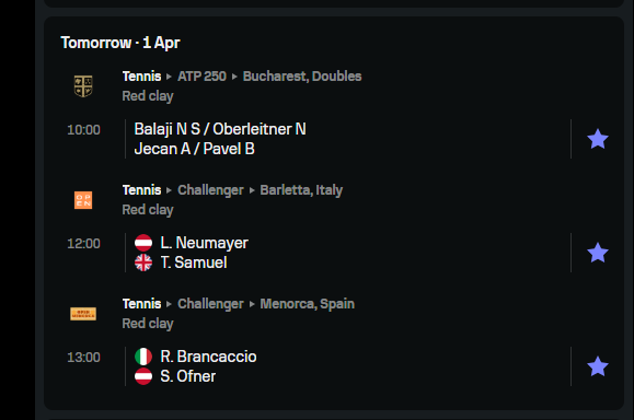 Diese Woche: ATP 250 Bukarest: Q1: Rodionov vs. Loffhagen (222) Q1: Schwärzler vs. Haita (1389) CH 100 Menorca: R1: Ofner vs. Brancaccio (380) R1: Kopp vs. Sanchez Quilez (527) CH 75 Barletta: R1: Neumayer vs. Ajdukovic (315) Rodionov, Schwärzler & Neumayer sind heute im Einsatz, der Rest erst morgen.