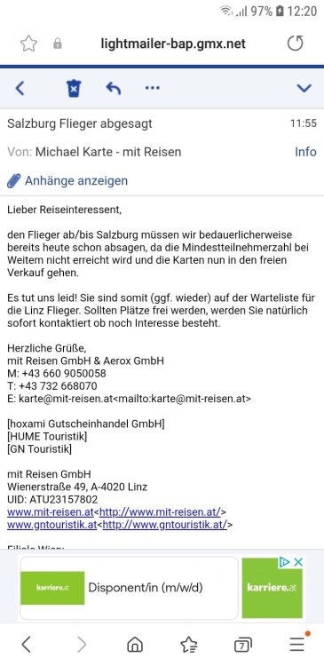 Salzburg Flieger wurde abgesagt. Ein Freund hat am Vormittag dieses Mail erhalten: Schöne Nachricht für mich, der separat gebucht hat und noch auf eine Karte im Away hofft… wie so viele