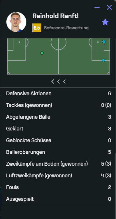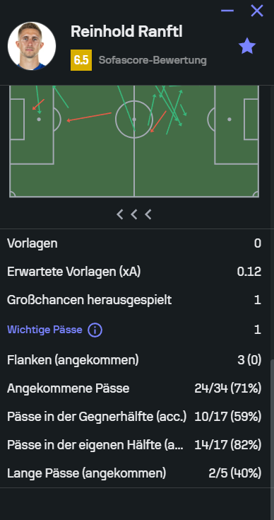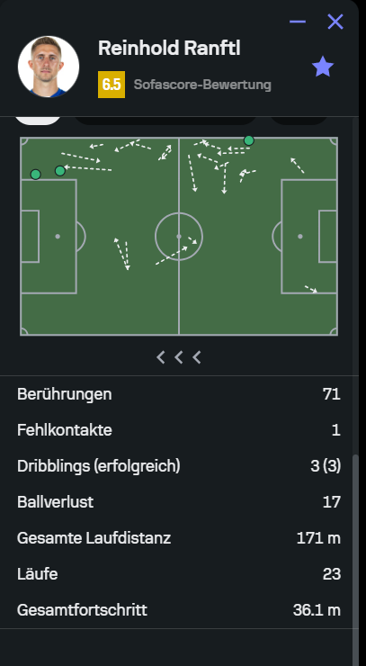 3. Tja, leider wieder kein Vergleich möglich, kein Einsatz für Pazourek und die Leistung von Ranftl ausbaubar mit 6,5. Wie gewohnt schlechte Pass Statistiken, der Wert erwartetet Vorlagen erschließt sich mir nicht, der ist eigentlich fast jedes Spiel das ich jetzt vergleiche unterirdisch, diesmal wäre aber eine Großchance dabei. Flanken keine angekommen. Wie immer reißt ihn seine Dribbling Statistik raus. Dafür diesmal 3 von 4 Luftzweikämpfe gewonnen - dies ist eher ungewöhnlich bei ihm, seit ich schaue.