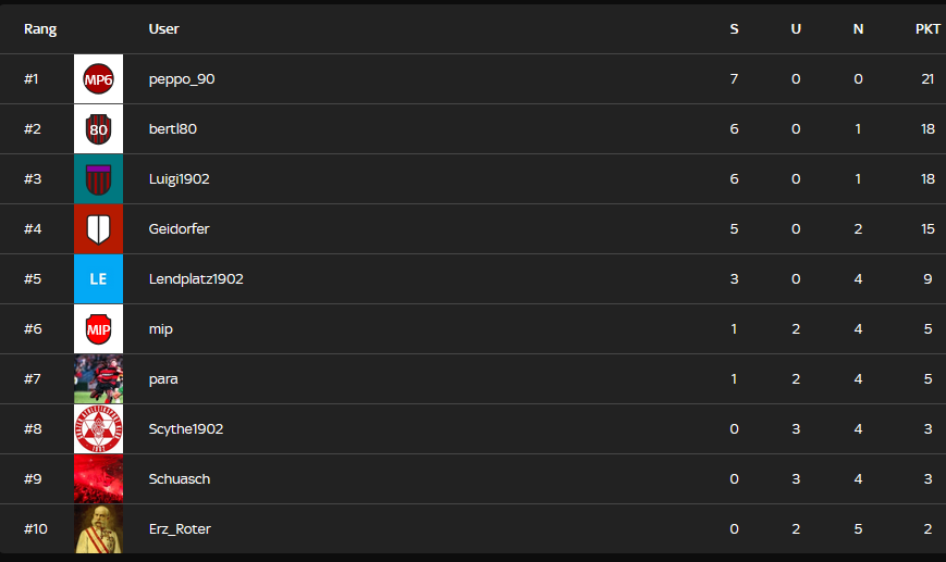 Zusammenfassung Liga 3: An dieser Runde sieht man auch wieder gut, warum es die 3. Liga ist: Punkteschnitt in Runde 8 war 1.518 (die anderen Ligen hatten einen Durschnitt von 1.849 bzw. 1.713). Das Spiel zwischen @Schuasch und mir endete mit einem Unterschieden, aufgrund der miserablen Punkteanzahl auf beiden Seiten dürfte das Spiel so ähnlich gewesen sein wie das Spiel unserer Roten gegen Ried Bester Spieler waren jeweils die Torhüter, wobei bei Schuasch unser lieber Jakob Meierhofer im Tor steht, der mit fast 400 Punkten auch die beste Leistung der Saison gezeigt hat. @Luigi1902 konnte sich gegen @Erz-Roter durchsetzen. Bei Luigi konnten Aiwu und Paul Koller aufzeigen (mit mehr als 300 Punkten), bei Erz-Roter konnte einzig Baumgartner vom WAC mit über 300 Punkten aufzeigen. @Peppo setzte sich ohne Probleme gegen @Geidorfer durch. Aber gut, bei Peppo sind auch Sahin-Radlinger, Karic, Bello und Eggestein im Team, die haben in dieser Runde wirklich aufgezeigt. Beim Geidorfer gibt es ja mit Mbuyi, Amane und Horn die geballte Rapid-Power, beim Derby konnte dieses Trio aber nicht ganz überzeugen (außer Mbuyi). @Lendplatz1902 feierte einen ungefährdeten Sieg gegen @Scythe1902. Obwohl 3 Spieler aus dem Team von Lendplatz nicht punkten konnten, konnte der Sieg durch die guten Leistungen von Bajic, Renner und Hülsmann eingefahren werden. Bei Scythe sticht eigentlich nur Thomas Sabitzer halbwegs heraus. Das letzte Spiel war ein klare Angelegenheit von @bertl80 gegen @para. Wie auch schon in der letzten Runde sticht beim Bertl wieder einmal Christensen im Tor heraus, aber auch Ratkov hat diesmal brav gepunktet. Beim Para konnte diesmal Havenaar überzeugen. Peppo ist nach wie vor an der Spitze, Geidorfer musste durch die Niederlage seinen 2. Platz an Bertl abgeben. Ich konnte mit meinem Unentschieden Para überholen, Scythe, Schuasch und Erz-Roter warten noch immer auf den ersten Sieg. Bei den Transfers hat sich auch etwas getan, da hatten einige zuviel Geld auf der Bank: Luigi hat Aiwu um fast 2,6 Mio. gekauft und das hat sich im ersten Spiel bereits ausgezahlt. Auch unser Bertl war sehr spendierfreudig, mit 4,6 Mio. hat er Rasmussen gekauft (zuvor verkaufte er unseren Tobias Koch an peppo um 3,3 Mio). Geidorfer hat sich Alex Schlager satte 4,2 Mio kosten lassen und Gadou wechselte um knapp 3.3 Mio. in das Team von Schuasch. Der Spitzentransfer war in dieser Woche jedoch der Kauf von Jan-Gorenc Stankovic von unserem Geidorfer, der satte 4,8 Mio. auf den Tisch gelegt hat.