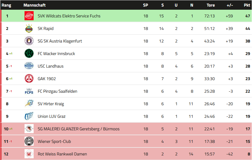 Heute Nachmittag fanden die letzten Nachtragsspiele statt: FC Pinzgau Saalfelden 0:1 Rot Weiss Rankweil Damen Mit dem überraschenden Sieg von Rankweil zögern sie das Unvermeindliche noch ein bisschen hinaus. Der Sieg bedeutet den ersten Punktegewinnn seit 6 Monaten und den ersten Sieg seit 6,5 Monaten. Saalfelden muss langsam aber sicher auch etwas aufpassen, nicht in die untere Tabellenregion hineingezogen zu werden. Der Vorsprung auf den 9. platzierten LUV Graz beträgt nur noch 3 Punkte. SG SK Austria Klagenfurt 4:1 SG Geretsberg/Bürmoos Klagenfurt stellt die starke Frühjahrsform einmal mehr unter Beweis. Es folgte bereits der 5. Sieg im 6. Spiel der Rückrunde. Geretsberg/Bürmoos steckt mit der Niederlage weiterhin in den Abstiegsrängen fest. Der Rückstand auf den rettenden 9. Platz beträgt schon 5 Punkte. Die aktuelle Tabelle: