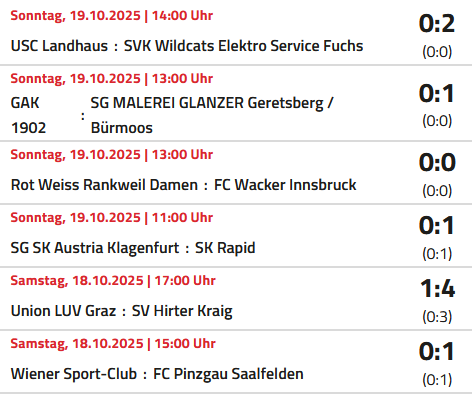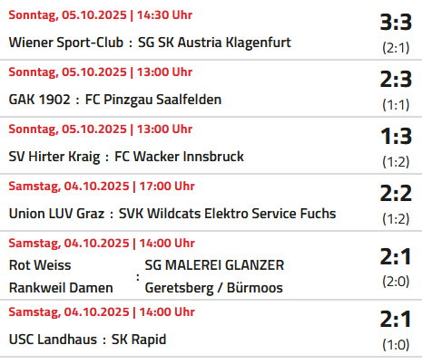 Wer ein bisschen Gegnerinnen Beobachtung vor dem Spitzenspiel nächste Woche machen möchte: Das Spiel Wacker Innsbruck - SpG SK Austria Klagenfurt wird heute auf ÖFB TV übertragen. Spielbeginn ist um 14:00 Uhr. Mal sehen, wie die Klagenfurterinnen mit der Drucksituation umgehen werden. Die Wildcats und wir haben gestern ja schon mal ordentlich vorgelegt. Link zum Spiel