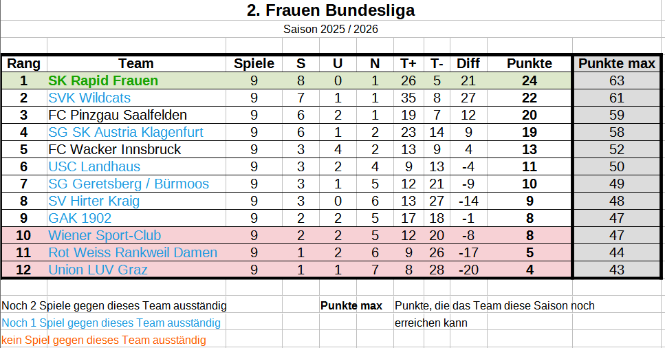 Kurzes persönliches Resümee zum Abschluss der 9. Runde: Ganz, ganz wichtiger Sieg gegen Klagenfurt! Bravo!!! War über das gesamte Spiel gesehen absolut verdient. Damit haben wir schon gegen 2 der 3 Top-Teams dieser Saison ein direktes Duell gewonnen! Wie @JR1988schon sagte: leider konnten uns uns die beiden anderen Wiener Teams keine Schützenhilfe leisten. Sehr ärgerlich, dass sich Landhaus gegen die Wildcats in der 77. Minute dieses unnötige Tor zum 0:1 gefangen hat. Remis wäre ansonsten durchaus drin gewesen. So offen wie Landhaus bei den beiden Gegentreffern in der Verteidigung war, hab ich die gegen uns aber noch nie gesehen Pinzgau/Saalfelden mit dem 4. Sieg in Folge. Die sollten wir auf jeden Fall auf der Rechnung haben. Bisher liefen die ja etwas unter dem Radar. Mit dem 1:0 gegen den WSC schicken sie die Wienerinnen zudem auf einen Abstiegsplatz. SV Kraig konnte sich mit dem 2. Sieg in Folge aus dem Tabellenkeller auf Platz 8 hocharbeiten. Mit dem 4:1 gegen LUV Graz verschärfen sie deren Krise. Auch für den GAK lief es zuletzt nicht nach Wunsch. Die 0:1 Niederlage gegen die SG Geretsberg/Bürmoos bringt die Grazerinnen auf Tuchfühlung mit den Abstiegsrängen. Es setzte die mittlerweile 5. Niederlage in Folge. Innsbruck mit dem bereits 4. Remis in dieser Saison. Das 0:0 gegen Rankweil hilft beiden nicht wirklich weiter. Rankweil steckt weiter in den Abstiegsrängen fest, Innsbruck hätte sich mit einem Sieg schon recht klar von Platz 10 absetzten können. Die Tabelle nach der 9. Runde: kurzer Ausblick: In den nächsten beiden Runden gibt es ganz interessante Partien unsere Verfolgerinnen betreffend: Runde 10: Pinzgau/Saalfelden - Klagenfurt Und in Runde 11 spielen wir zu Hause gegen Pinzgau/Saalfelden während die SK Austria Klagenfurt zu Hause gegen die Wildcats antreten muss Da nehmen sich einige Teams gegenseitig Punkte. Wäre wichtig, die ausstehenden beiden Spiele zu gewinnen