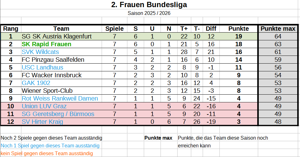 So, noch ein kleiner Rückblick auf die 7. Runde: Leider setzte es für uns die 1. Saisonniederlage. Ärgert mich immer noch ziemlich und wäre total vermeidbar gewesen. Aber seis drum. Immerhin konnten unsere zwei direkten Konkurrentinnen die Situation nicht wirklich ausnuzten. Sowohl die Wildcats, als auch Klagenfurt kamen nicht über ein Unentschieden hinaus. Das 3:3 bei WSC gegen Austria Klagenfurt war dabei für mich die etwas größere Überraschung. Sehr schade, dass der WSC, der zwischenzeitlich schon 3:1 geführt hatte, den Sieg nicht über die Distanz bringen konnte. Da ich das Spiel live sehen konnte, ein paar Eindrücke: Austria Klagenfurt hat in den ersten Minuten extrem angepresst. Da konnte sich der WSC kaum befreien. Nach der Startoffensive kamen die Wienerinnen dann aber immer besser ins Spiel und das Match gestaltete sich relativ ausgeglichen. Klagenfurt konnte sich zwar einige Hochkaräter erspielen, die aber von der sehr starken Torfrau entschärft wurden. Sie setzte sich sehr cool zweimal im 1 gegen 1 gegen eine Kärtnerin durch. War das sehr schnell und gut beim herauslaufen. Die guten Chancen für Klagenfurt folgtem meist einem einfachen Rezept: 1) Balleroberung im Mittelfeld und dann ein schneller Ball in die Spitze. 2) Langer, weiter Ball von der Torhüterin bzw. der Verteidigung in die Spitze. (Vor allem in Hälfte 1, denn da hatten sie den Wind im Rücken. In Hälfte 2 führte diese Variante kaum noch zum Erfolg) Sie haben auf beiden Seiten 2 schnelle, technisch gute Spielerinnen. Auf die gilt es aufzupassen! Pinzgau/Saalfelden prischt sich weiterhin kontinuierlich an die Top 3 heran. Hätte nicht gedacht, dass sie auch beim GAK auswärts gewinnen werden. Die gilt es auch im Auge zu behalten. Der SV Hirter Kraig setzt seinen Negativlauf weiter fort. Mittlerweile hat sich die Niederlagenserie auf 6 Spiele erhöht. Zumindest können sie sich trösten, da sie bei den 7 Spielen schon gegen die Teams auf Tabellenrang 1,2,3,4 und 6 spielen mussten. Gegen die 8. platzierten WSC konnten sie zumindest gewinnen. Allerdings ging auch das Match gegen Geretsberg/Bürmoos verloren - die ebenfalls im Tabellenkeller feststecken. Die nächsten beiden Runden geht es gegen Rankweil zu Hause und LUV Graz auswärts. Sollten sie da auch verlieren, schauts schon sehr düster aus. Andererseits könnten sie sich mit 2 Siegen auch ins Tabellenmittelfeld katapultieren. Wird spannend zu beochbachten. Im Duell der Nachzüglerinnen zwischen Rankweil und Geretsberg/Bürmoos setzte sich Rankweil durch, womit sie als letztes Team ihren 1. Saisonsieg feiern konnten. Zum Abschluss die aktuelle Tabelle: