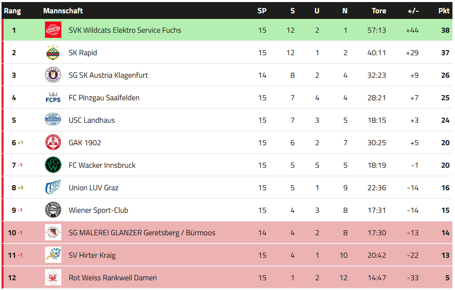 Der Rückblick auf die 15. Runde: SV Hirter Kraig - FC Pinzgau Saalfelden Die Kärtnerinnen verlieren auch ihr 4. Spiel in der Rückrunde und rutschen einen Tabellenrang auf Platz 11 ab. Saalfelden konnte den 4. Tabellrang mit dem Sieg verteidigen und Punkte auf die 3. platzierten Klagenfurterinnen gut machen. SG SK Austria Klagenfurt - Union LUV Graz Die Klagenfurterinnen verloren (zumindest für mich) überraschend klar gegen LUV Graz zu Hause mit 1:3. Dadurch verließen die Grazerinnen die Abstiegsränge und verbesserten sich auf Platz 8. Zu erwähnen: Linda POPOFSITS (Kooperationsspielerin von Sturm Graz) erzielte alle Tore der Grazerinnen. Auf die müssen wir am Wochenende wohl gut aufpassen. Rot Weiss Rankweil Damen - SK Rapid Frauen Mit einer überzeugenden Leistung konnten sich unsere Frauen auswärts klar mit 3:0 durchsetzen. Damit bleiben wir an den Wildcats dran. Für Rankweil war es bereits die 6. Niederlage in Folge. USC Landhaus - FC Wacker Innsbruck Für Innsbruck geht die schwache Rückrunde weiter. Nach dem Remis gegen Saalfelden zum Auftakt setzte es bereits die 3. Niederlage in Folge. Dadurch rutschen die Innsbruckerinnen auf Platz 7 zurück. Landhaus hingegen konnte den 3 Sieg im 4. Rückrundenspiel einfahren und bleibt weiterhin auf Rang 5. GAK 1902 - Wiener Sport-Club Der GAK fährt den dritten 1:0 Sieg in Folge ein und verbessert sich auf Rang 6. Die Wienerinnen hingegen verloren das 2. Spiel in Folge und rutschen auf Platz 9 ab. Der Vorsprung auf Geretsberg/Bürmoos beträgt nur noch 1 Punk (wobei die Salzburgerinnen ein Spiel weniger ausgetragen haben). Für den WSC geht es mittlerweile klar um den Klassenerhalt! SG Geretsberg/Bürmoos - SVK Wildcats Die Krottendorferinnen stellten auch auswärts in Bürmoos ihre aktuelle Topform unter Beweis und gewannen klar mit 3:1. Damit verteitigten sie die Tabellenspitze. Für die SG Geretsberg/Bürmoos bedeutet die Niederlage ein Abrutschen auf Platz 10. Damit sind sie wieder in den Abstiegsrängen. Punktecheck: Nach dieser Runde ist es offiziell: Wir können nicht mehr absteigen Rankweil, Kraig und der WSC können uns diese Saison nicht mehr überholen Zum Abschluss die aktuelle Tabelle: