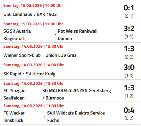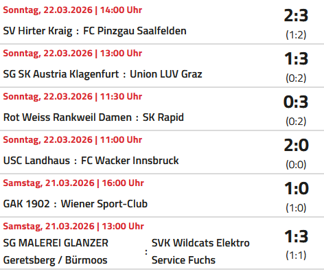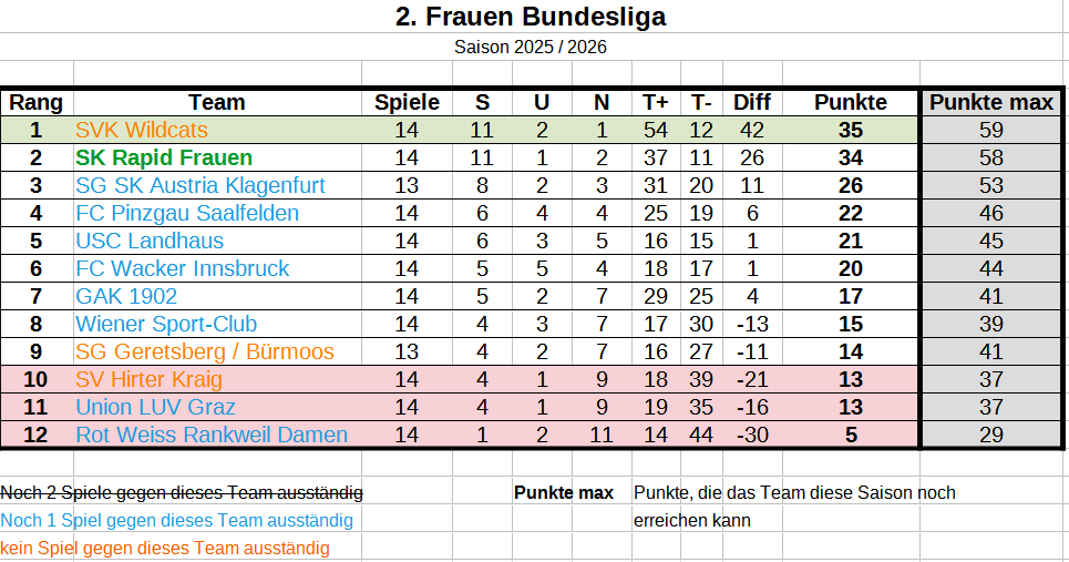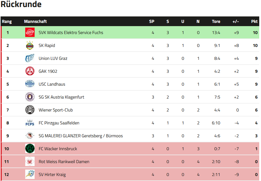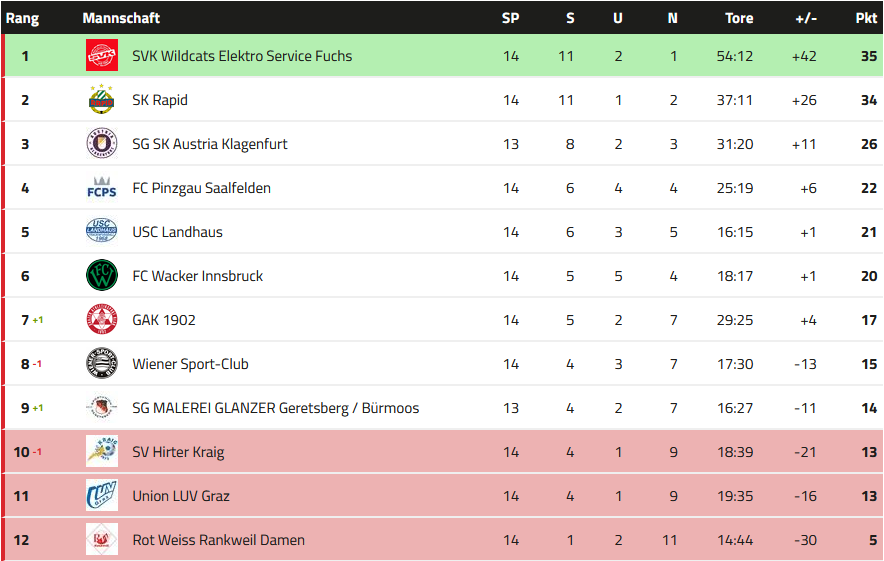 Der Rückblick auf die 14. Runde: Wacker Innsbruck - SVK Wildcats Die ersatzgeschwächten Innsbruckerinnen mussten sich den Wildcats leider klar mit 0:4 geschlagen geben. Die Wildcats beweisen einmal mehr, in welcher Top-Form sie diese Saison spielen und bleiben damit auf dem 1. Tabellenrang. FC Pinzgau Saalfelden - SG Geretsberg/Bürmoos Für mich die Überraschung der Runde. Die SG Geretsberg/Bürmoos gewinnt auswärts beim FC Pinzgau Saalfelden mit 3:1. Es war der 1. Sieg für Geretsberg/Bürmoos gegen Pinzgau Saalfelden. Alle bisherigen 5 Spiele konnte Saalfelden gewinnen. Durch den Sieg konnte Geretsberg/Bürmoos die Abstiegsränge verlassen. Wiener Sport-Club - LUV Graz Die Grazerinnen konnten einen wichtigen Auswärtssieg im Kampf um den Klassenerhalt erzielen. Sie setzten sich doch recht klar mit 3:1 gegen die Wienerinnen durch. Mit 13 Punkten liegen die Grazerinnen zwar immer noch auf einem Abstiegsrang, jedoch nur noch einen Punkt hinter Platz 9 bzw. zwei Punkte hinter Platz 8. Der WSC rutschte durch die Niederlage einen Rang zurück und liegt nun auf Platz 8. SG SK Austria Klagenfurt - Rot Weiss Rankweil Damen Die Kärntnerinnen gewannen auch ihr zweites Spiel in der Rückrunde. Allerdings gerieten sei gegen die Vorarlbergerinnen mit 1:2 in Rückstand, konnten das Spiel jedoch drehen. Der 3:2 Siegestreffer fiel erst in Minute 90.+3, womit Austria Klagenfurt einmal mehr ihre Gefährlichkeit in der Schlussphase bewiesen. Rankweil musste ab der 56. Minute mit einer Frau weniger spielen. Wodurch die späte Niederlage noch bitterer wirkt. USC Landhaus - GAK 1902 Der GAK konnte in Wien knapp mit 1:0 gewinnen und klettert auf Rang 7. Rapid Frauen - SV Hirter Kraig Mit einem verdienten Sieg bleiben wir an den Wildcats dran. Mit der Niederlage bei uns und durch den Sieg von Geretsberg/Bürmoos fallen die Kärntnerinnen wieder auf die Abstiegsränge zurück. Punktecheck: Wir können diese Saison nicht mehr Letzter werden Zum Abschluss die aktuelle Tabelle: