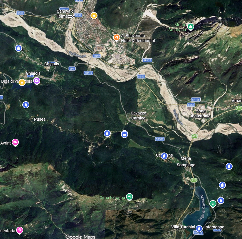 Den nächsten Ort, den ich euch etwas näher bringen möchte, ist Cividale del Fiuli. Östlich von Udine gelegen, nahe der slowenischen Grenze mitten in einem wunderbaren Weinbaugebiet. Der Ortskern ist noch sehr guten erhalten und bietet viele enge Gassen, nette Cafes, Geschäfte und Lokale. Die Hauptattraktion ist die Ponte del Diavolo (Teufelsbrücke), welche einspurige befahrbar ist. Um diese Brücke ranken sich so viele Mythen und Geschichten. Direkt dahinter in der Altstadt gibt es alte Gänge aus Zeiten der Langobarden und eine wunderschöne Kirche. Solltet Ihr dorthin einen Abstecher planen, so kann ich euch das Caffe Longobardo für einen kurzen Halt empfehlen. Wollte Ihr eine Kleinigkeit essen und guten Wein kosten, ist die nahe gelegene Enoteca l´Elefante sehr empfehlenswert. Kleine Snacks in Form von Panini und eine große Auswahl an regionalem Wein. Wollte Ihr richtig typische, friaulische Küche, so lege ich euch das Lokal Antico Leon d´Oro ans Herz. Dieses liegt zwar außerhalb der Altstadt (direkt nach der Ponte del Diavolo), ist aber mit dem wunderschönen Innenhof, der hervorragenden, regionalen Küche und einer wunderbaren Weinauswahl einfach sensationell. Vor allem an schönen, warmen Sommernächten ein Genuss in jeder Hinsicht. Als kleine Empfehlung für Mitbringsel. In der Gegend gibt es einen sehr speziellen Rotwein namens Schioppettino. Diesem Rotwein wird nachgesagt, dass man beim ersten Schluck weiß, ob man Ihn liebt oder hasst. Bei mir war es Liebe und selbst meiner damaligen Lebensgefährtin (welche Wein generell nicht mag, am ehest Spritzer) hat er gemundet. Über den Ort gibt es sogar einen Roman namens Teufelsbrücke, geschrieben von einem Österreicher, welcher sich viel in der Gegend Friaul aufhält. Dazu werden auch einige Orte der Umgebung beschrieben. Man sollte hier auch unbedingt die Brda (slowenische Seite des Weingebiets) und generell die Umgebung mit erkunden. Es ist ein wunderschöner Flecken Erde, der noch ein wenig ein Geheimtipp ist. Dazu ist auch die Zugfahrt von Udine nach Cividale ein Erlebnis für sich. Du meinst vermutlich den See rechts unten im Ausschnitt der Karte. Der ist es nicht. Es ist der gelbe Stern südwestlich von Tolmezzo im Ausschnitte (ca. Links/Mitte).