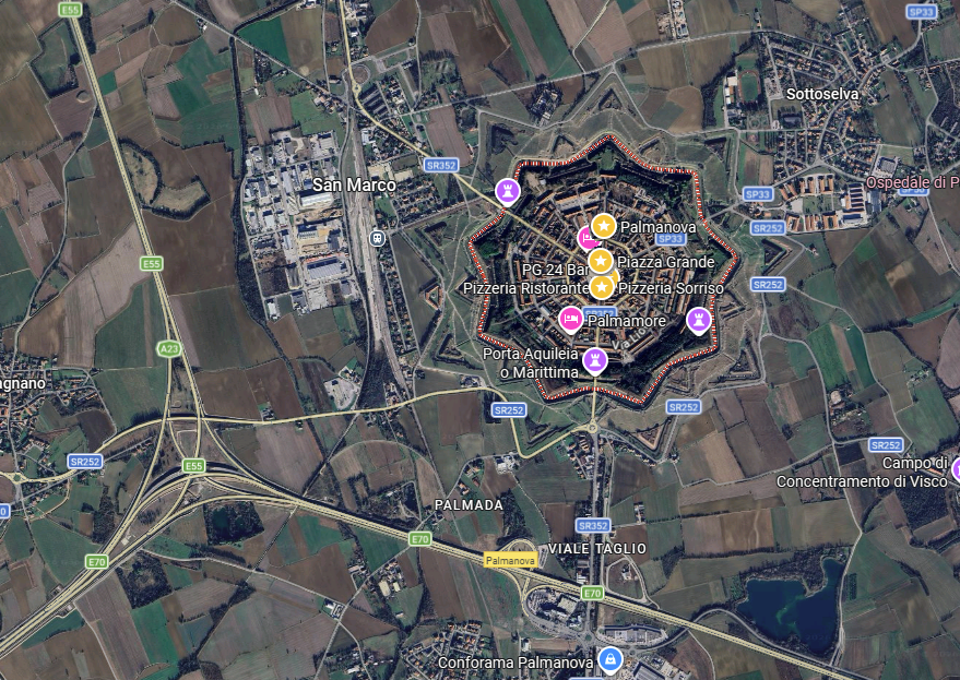 Und weil ich heute motiviert bin, lege ich ein weiteres Juwel nach. Palmanova. Der Name wird vielen Adria-Urlaubern etwas sagen, steht er doch ganz Prominent auf den Tafeln überkopf, kurz bevor man nach Rechts Richtung Bibone, Lignano und Co abbiegt. Das Autobahnkreuz (Rechts wie beschrieben, Links gehts nach Triest => dazu ein ander mal) wird ebenso genannt, liegt es eben direkt am gleichnamigen Ort, und auch so mancher wird schon das hiesige Outletcenter aufgesucht haben. So weit so gut. Alle die Palmanova selbst noch nicht besucht haben, sollten zumindest auf der Reise gen Süden einen Kaffeestop einplanen. Es lohnt sich. Der Ost selber ist Sternförmig angfelegt, hat 3 Haupttore und eine ebenfalls sternförmige Stadtmauer. Auch die Umgebung íst teilweise noch sternförmig erkennbar. Es war früher ein Verteidigungsposten der Venetianer und wurde auch nur ganz selten eingenommen. Kurz war es unter Österreichischer Flagge, was der entsprechende Soldatenfriedhof im Umfeld auch bezeugt. Der Ost selber ist sehr eng gebaut, die Straßen sind beinahe alle als Einbahnen geführt, was klassisch italienisch etwas chaotisch wirkt. Das Highlight neben der Form und den Stadttoren ist eindeutig der riesige Hauptplatz (riesig im Sinner der Stadtgröße). Dies stammt noch als militärischer Zeit und war als Exerzierplatz gedacht. Dort gibt es auch ein paar nette Cafes und Lokale sowie eine schöne, alte Kirche. Ab und an ist dort auch ein Markt. Von der Autobahn runter, nach Palmanova rein, ein kurzer Spaziergang mit Kaffee und wieder auf die Autobahn lässt sich in 1 Stunde stressfrei bewältigen. Wenn man etwas isst entsprechend länger. Man hat dann auch im Grunde alles gesehen. Trotzdem bleibe ich beinahe immer dort stehen, wenn ich am Weg gen Süden bin, da ich den Ort einfach schön und angenehm finde. Vor allem tummeln sich dort recht wenig Touristen.