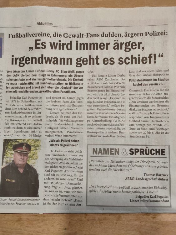 Ein Artikel aus der "Hallo Oberösterreich" vom November Nr. 302 Linzer Derby und gewaltbereite Fans !?