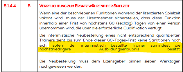 60 Tage darf der Interimstrainer werken, aber er muss die nächstniedrigere Ausbildungserlaubnis, also in dem Fall die A-Lizenz, besitzen, sonst gibts Sanktionen.