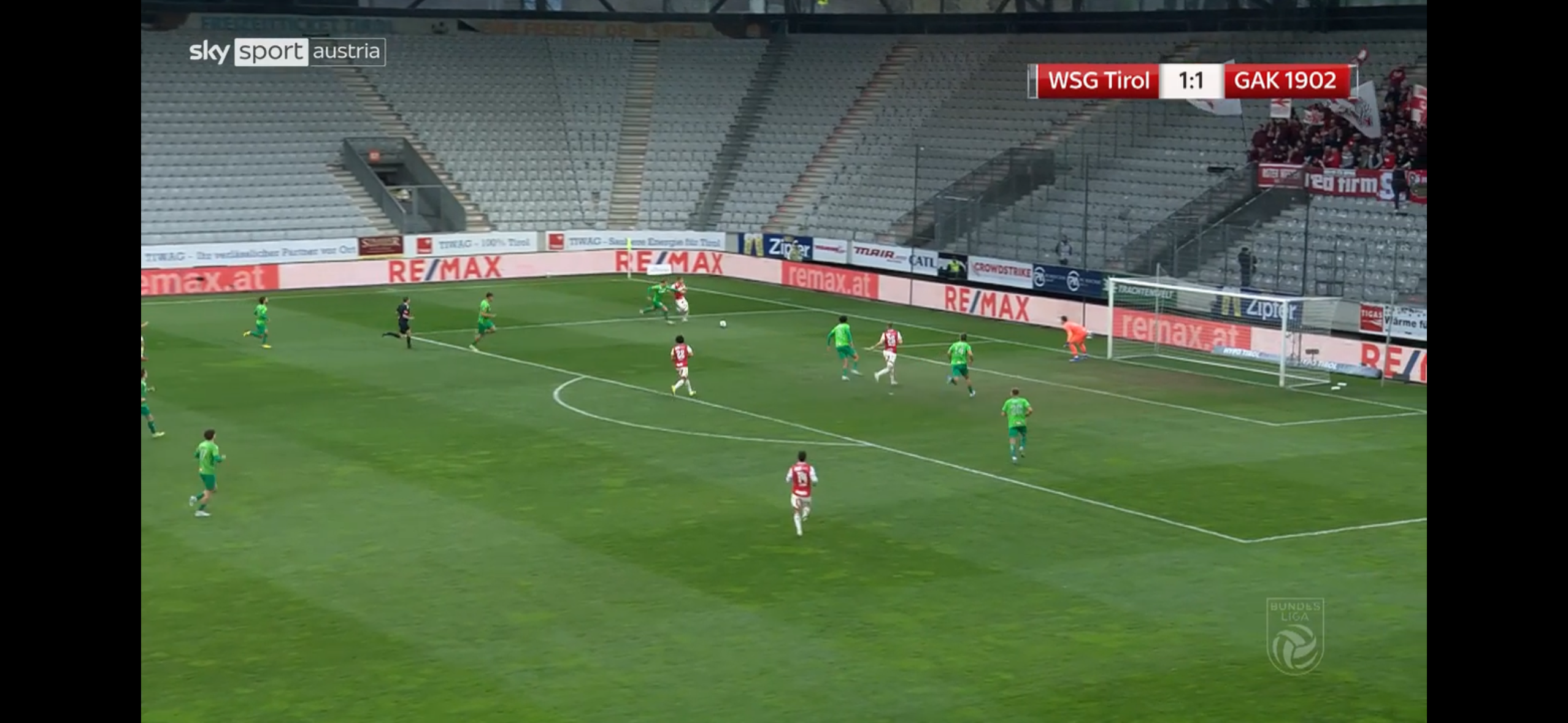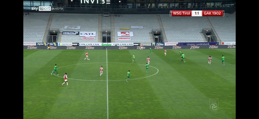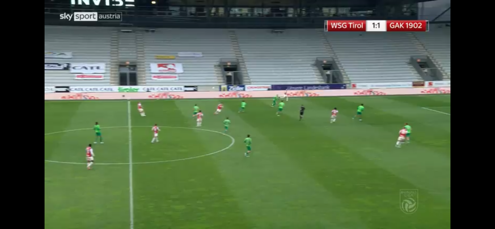 Gut, dass du dich getäuscht hast Auf dem Ersten Bild sieht man gut den Plan von Tirol, Naschberger war auf Lichtenberger abgestellt und der zweite IV (Boras) sollte auf diesen Druck machen falls er den Ball bekommt. Lichtenberger war gerade zu Beginn des Spiels nicht so aktiv eingebunden und die zeitweise Doppelung der Tiroler war sicher ein Mitgrund dafür. Auf dem zweiten Bild sieht man wie sehr Klassen hinein in Richtung von Olesen läuft, wodurch Sulzbacher ihm sehr weit folgt. Sulzbacher und Boras sind durch ihre Orientierung auf Klassen und Lichtenberger beim Pass auf Vraa aus der Position und komplett aus der Szene draußen. Auf dem dritten Bild sieht man dann, dass Lawrence 1:1 mit Harakate ist aber wegen der guten Mitnahme von Vraa den Weg zum Tor zu machen muss. Boras und Sulzbacher sind viel zu weit weg von Harakate und können nicht mehr eingreifen. Ich finde den Spielzug insofern bemerkenswert weil er eigentlich ein direkter Konter auf die taktische Idee von der WSG war. Sie haben Lichtenberger immer wieder gedoppelt da wir vor allem durch ihn in den letzten Spielen gut das Mittelfeld überspielt haben. Es freut mich sehr dass wir mittlerweile zu einem Plan A auch Alternativen oder Antworten auf den Gegner vorbereiten, sollte unser Plan A zugestellt sein! Edit: „Zweites Bild vergessen hochzuladen“