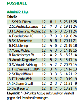 https://epaper.vn.at/sport/2025/11/12/austria-lustenau-nun-tabellenzweiter.vn Austria Lustenau profitiert vom Rückzug des SV Stripfing Der SV Stripfing hat seine Zulassung für die 2. Admiral-Fußball-Liga freiwillig zurückgelegt und scheidet mit sofortiger Wirkung aus dem laufenden Bewerb aus. Die Bundesliga bestätigte am Mittwoch den Rückzug des insolventen Clubs. Anfang November waren zahlreiche Spieler aufgrund ausstehender Gehaltszahlungen aus ihren Verträgen ausgestiegen, am Montag folgte schließlich die Eröffnung eines Konkursverfahrens am Landesgericht Korneuburg. Mit dem Ausscheiden werden sämtliche bisher absolvierten Saisonspiele Stripfings annulliert und aus der Wertung genommen. Spielerstatistiken aus diesen Partien verfallen, erhaltene Karten bleiben hingegen bestehen und werden weitergeführt. Lustenau zurück im Titelrennen Der große Nutznießer der neuen Situation ist Austria Lustenau. Die Vorarlberger hatten gegen Stripfing nur einen Punkt geholt und verlieren somit lediglich einen Zähler. Tabellenführer St. Pölten, die Admira und der FAC, die jeweils Siege eingefahren hatten, büßen dagegen drei Punkte ein. Dadurch rückt die Spitze enger zusammen: Nach zwölf Punkten Rückstand gilt Lustenau nun plötzlich wieder als ernsthafter Aufstiegsanwärter und liegt nur noch einen Punkt hinter St. Pölten. Tabelle stimmt wohl nicht ganz in aufgrund der Tordifferenz sind wir dritter. Spiel aber zum derzeitigen Zeitpunkt keine Rolle.