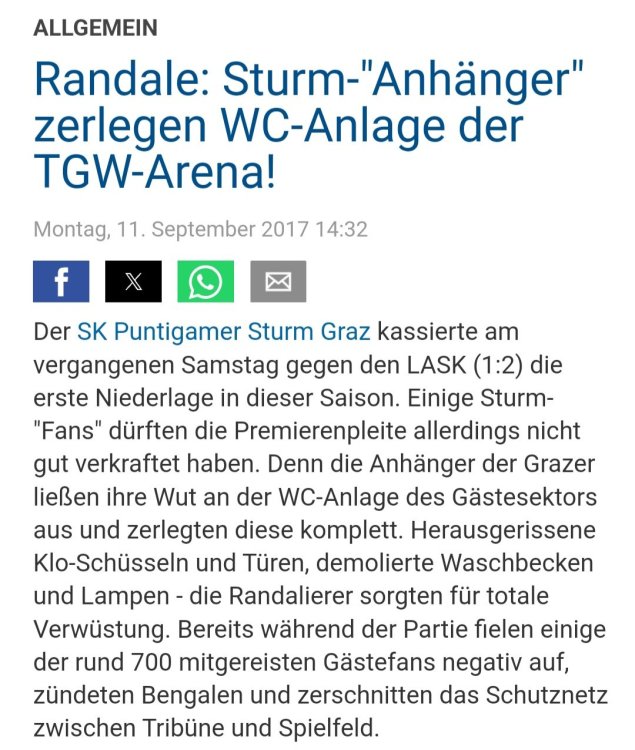 Is eh klar. Wo viel Menschen immer und überall (wenige) Sautrottel. Wollte nur ein Beispiel bringen, dass das anderswo leider Gottes auch passiert, da @Rasmus behauptet hat, das gibt's nur in Liebenau. Was eh egal wäre, aber er damit wieder einmal unterschwellig assoziieren wollte, das selbst bei Volltrotteln einzig und allein das Stadion Liebenau an sich schuld sei.