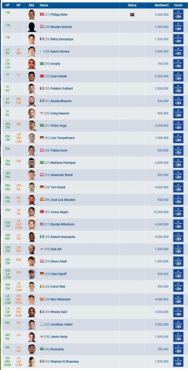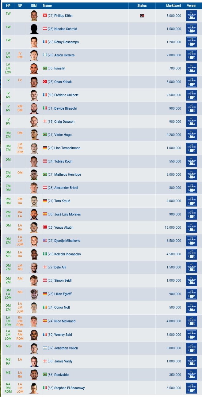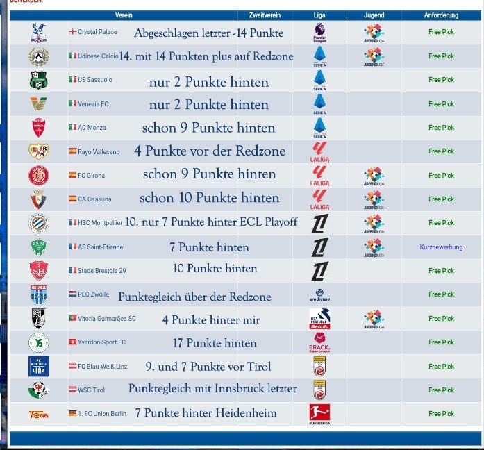 Ich möchte hier mal kurz die Werbetrommel auspacken! aktuell gehen wir in die Crunchtime der Saison 34. In Italien kannst dich mit Udinese schön an die Sim eingewöhnen bevor es dann ab Jänner in die neue Saison geht und du hast eine funktionierende Jugend, Sassuolo und Venezia sind der Extra kick die Manschaften die Saison über dem Strich zu bekommen. In Spanien hast mit Vallecano ein interessantes Projekt mit B und C Mannschaft sowie U19 im RL genug Potential auch langfristig frisches Material zu haben um in der Sim auch eine Jugendmannschaft zu stellen die sich die Ligen hoch fightet. In Frankreich mit Montpellier echt eine starke Truppe die es noch nach Europa schaffen könnte und auch noch 2 Jungspieler die im Nachwuchs das erste Team entsprechend verstärken könnten. In den Niederlanden ists ein Battle bis zur letzten Runde um den letzten Platz für die neue Saison. In Österreich @Linzah (oder jemand anderen eurer Truppe) einen echt starken Kader der mit etwas Schliff nächste Saison in Europa spielen kann. Das Duell Wattens vs. Innsbruck ist natürlich auch was fürs Prestige in Tirol. Bei den anderen Mannschaften heißt meine Empfehlung dann doch bis Ende der Woche zu warten bis wir die Liste der Aufsteiger haben für die man sich für Saison 35 (ab Jahresbeginn) dann bewerben kann. Ich lass euch dann gern per PN den aktuellen Kader in der Sim zukommen das ihr seht wen ihr dann einberufen müsst. Meldet euch jedenfalls mal an lest euch die Regeln durch. Spiele sind alle 3 Tage so das es wirklich kein Stress für Dauersurfer wie uns sein sollte. -