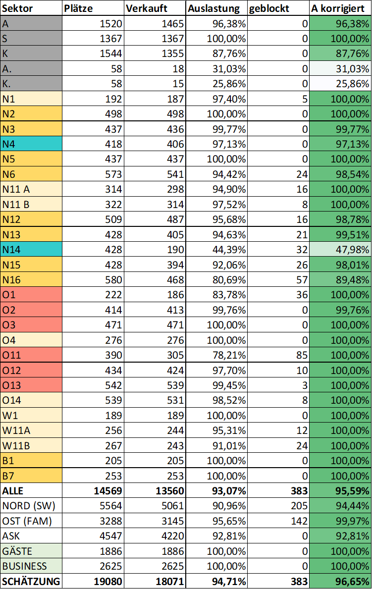 Laut Pressekonferenz beträgt das Kontingent für den Vereinsspieltag tatsächlich 4000 Plätze. Somit kann man wohl davon ausgehen, dass auch auf der Businesstribüne Sektoren wie B1, B7, B11, B12, B16 oder B17 damit belegt sind und nicht mehr freigeschaltet werden können. Demnach ist das, was es aktuell online zu haben gibt, wohl auch tatsächlich der letzte Rest (evt. wird von den letzten Reihen in N14 noch etwas freigegeben, das ist in der Vergangenheit vorgekommen - ebenso sichteingeschränkte Plätze). Die erwähnte Zahl von 18k verkauften Tickets halte ich insgesamt für nachvollziehbar. -