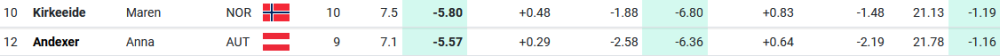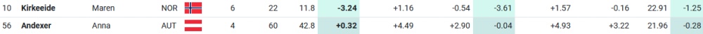 Das ist nur ein Beispiel. Diesen Vergleich kann man noch mit vielen anderen Athletinnen wie Bendika, Guigonnat, Auchenthaller usw. machen, das Resultat ist immer dasselbe. Letztes Jahr war sie fast gleichauf oder schneller, dieses Jahr ist sie bei weitem langsamer. Also entweder alle anderen haben einen Riesensprung nach vorne gemacht, oder Andexer hat extrem abgebaut seit sie im Weltcup-Team dabei ist. Oder das Material ist tatsächlich so schlecht wie alle immer sagen