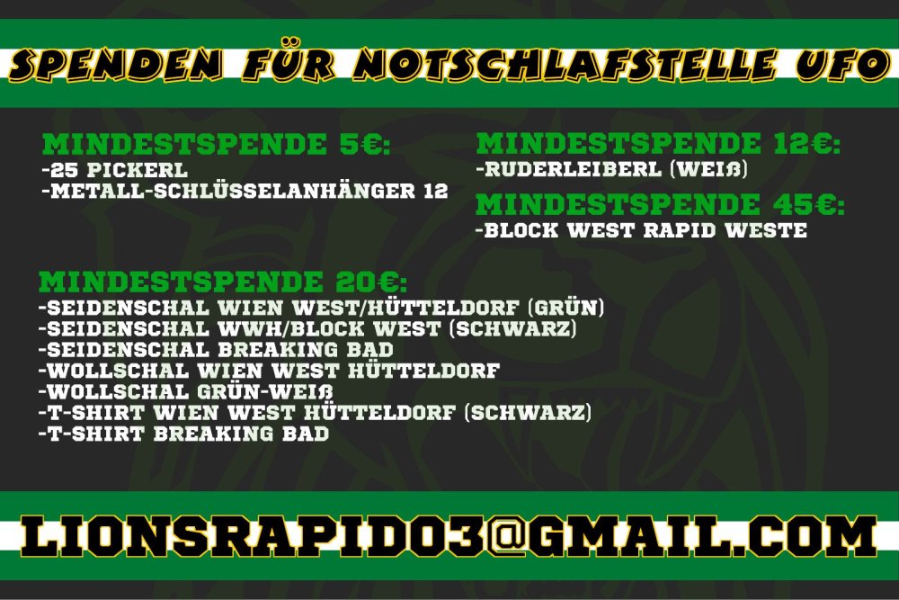 Mit dem Ende des Grunddurchgangs wurde auch die Spendenaktion der Green Lions beendet. Einen Bericht darüber findet ihr unter: http://www.greenlions.at/archive/57345 Danke an alle fleißigen SpenderInnen! Das ist Rapid!