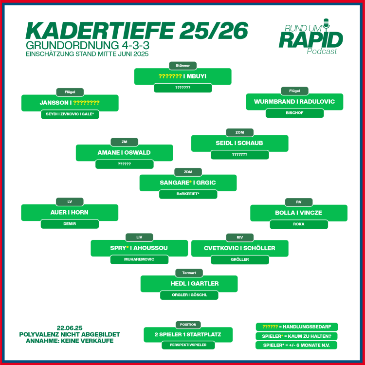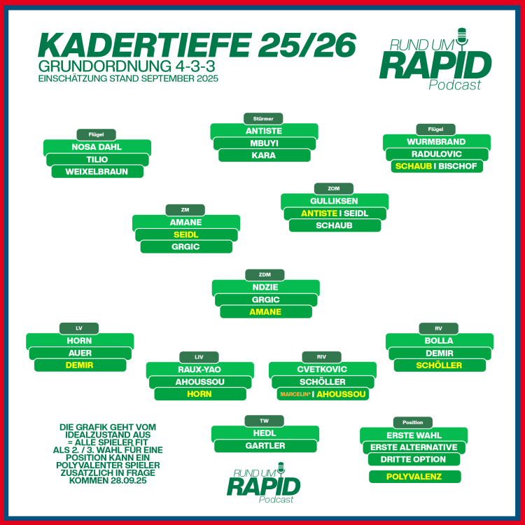 Folge 94 - Kadertiefe & Philosophie des SK Rapid unter Stöger & Sageder #rundumrapid Warum welcher Spieler wo steht & welche Gedanken dahinter stecken, dass ich ein 4-3-3 als (durchaus flexibel zu verstehende) erwartbare Grundordnung für den SK Rapid unter Peter Stöger gewählt habe - hört ihr in dieser Folge 🎧 Inhalte: Erklärungen zur Grafik & ihren Kompromissen Überlegungen zum 4-3-3 & der logischen Alternative 3-4-3 Sind Mama & Raux-Yao zu halten? Aktuelle Baustellen im Kader Transfers, Gerüchte, Planungen Mein Take zu Arnautovic In unbändiger Liebe zu Rapid! Euer Maximilian Link zur Folge: https://rundumrapid.buzzsprout.com/1972142/episodes