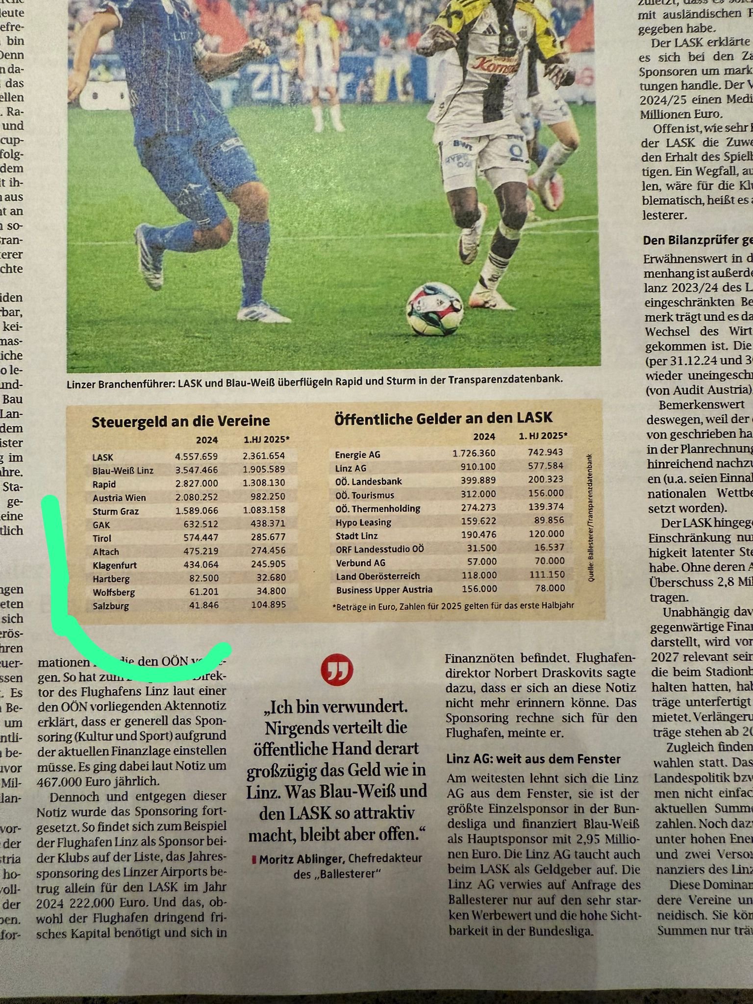 Das ist ja der Teufelskreis, in dem auch die Politik steckt, wenn sie nichts mehr zuschießt: Den Verein pleite gehen lassen, geht nicht. Dann hat man für die Infrastruktur zu viel Steuergeld verprasst. Also wird immer wieder, auch über die Umwege der landeseigenen Energieversorger, Kohle reingebuttert. Siehe Klagenfurt: Da steht ein Stadion, in das jährlich 1 Mio an Steuergeld von der Stadt für die Erhaltung nachgeschrieben werden muss. Da wird dann so lange in einen Verein investiert, bis gar nichts mehr geht. Die goldenen Zeiten sind vorbei. Und mittelfristig wird's bei einigen Vereinen ziemlich krachen. Besonders bei denen, die sich auf Steuergeldern ausgeruht haben.