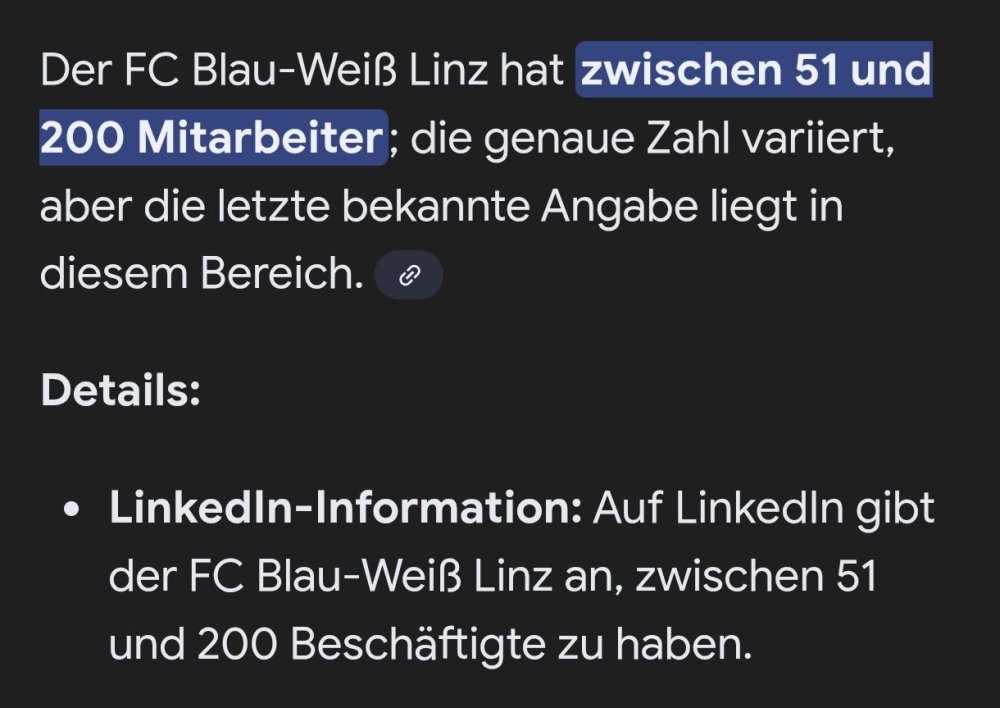Beim LASK spuckt die KI mehrere Dutzend MA aus, bei BW Linz zwischen 50 und 200. Wenn du unser KELAG Sponsoring (Premiumsponsor!) betrachtest, kannst mit den €65.000,- gerade einmal das Jahresgehalt von 2 nicht allzu gut bezahlten Vollzeitmitarbeitern bestreiten (inkl. Zuschläge für Sa und So) Nur, dass man einmal die Relation sieht. Aber es werden ja sowohl bei uns als auch beim TSV zB. die Dressen belächelt oder darüber gespöttelt (lebende Litfaßsäulen,...) Da geht's nicht nur ums Stadion. Bei Ausgaben wie Rasen, Buchhaltung, Reisen, Nächtigungen, Sicherheit, Erfüllung der Auflagen der BL oder UEFA oder viele andere Bereiche gibt's keine Kompromisse, wo viel eingespart werden kann. Aber es wird halt viel gejammert, manches auch wahrscheinlich zurecht kritisiert. Aber über die Hintergründe macht sich so mancher keine Gedanken. Da ist's einfacher, hinzuhauen, draufzuhauen. Deshalb gibt's für mich die Devise: Sich über sportliche Erfolge umso mehr zu freuen, denn mit diesen finanziellen Voraussetzungen in Ö das zu erreichen, was wir bisher erreicht haben, ist mit Sicherheit einmalig.