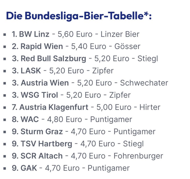 Einen Meistertitel haben wir schon geholt diese Saison! Mit dieser Tabelle am Ende der Saison könnte ich gut leben. Quelle: https://www.puls24.at/news/sport/fussball-bundesliga-oesterreich-bier-bratwurst-preise-teuer-wien-salzburg-graz-ranking/347143