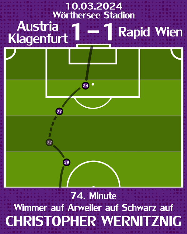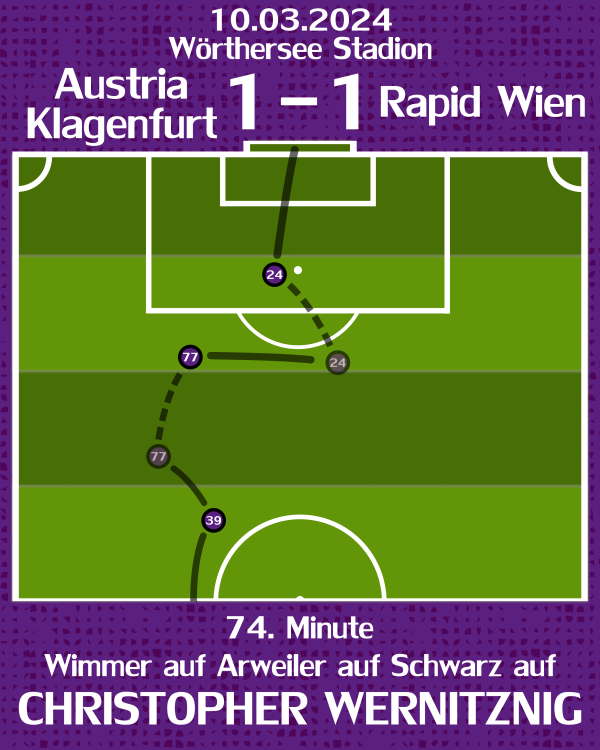 Stimmt, habs mir noch mal angeschaut, ich dachte wuschi macht noch ein paar meter mit ball, war aber eine ziemliche direkt abnahme, dem nehme ich mich morgen nochmal an Wobei ich nicht ganz verstehe was du mit "nichts von rechts" meinst, die durchgehende linie ist der pass von schwarz auf wernitznig von links, die strichlierte wäre ein laufweg, den er, wie ich jetzt gesehen hab, aber nicht gemacht hat, so oder so wäre der ball von links gekommen -