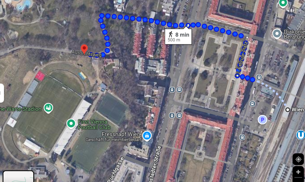 Das ist der schnellste Weg von der S-Bahn/U-Bahn Station zum Gästeeingang. Auf der Vienna Seite gibt es auch Infos zum Gästesektor. https://www.firstviennafc.at/news/2022-07-21/infos-zum-neuen-gaestezugang.html -