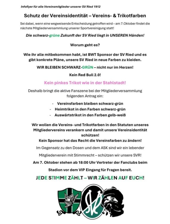 Alleine die 2 Aussagen: Das weltweit im Sport-Marketing bekannte BWT-Pink wird auch im Stadion in Ried ein unübersehbares Zeichen setzen. Beim gelben Auswärtstrikot sei es nicht ausgeschlossen, dass man gewisse Pink- oder Rottöne ins Trikot implementieren werde. Eine Entwicklung die mir persönlich überhaupt nicht gefällt besonders, weil ich gedacht hätte das wir zumindest ein bisschen schlauer als die Linzer sind. Da braucht sich keiner wundern wenn gewisse Personen wieder Polizeischutz benötigen.