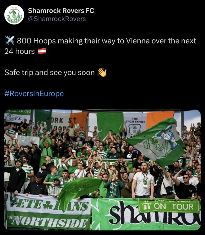 Morgen. Danke for your hospitality last night. The whole evening was organized very well. Very impressive. Rapid Ultras and BlockWest members are one of the leaders in creating unique and important displays and choreo. Last night was superb 👏🏻 This game in WestStadion was the highest attended game in the competition last night. That tells me there was an appetite to come see both teams, and how important both clubs consider the success behind it, to be. Rovers brought one of the biggest away support to WedtStadion this year. We are very proud to have done so. It helped create a cutting atmosphere. The purple nonsense? Yes. Our colours are green and white hoops, and your display was to the point, and it told us all we needed to know. The colour and the shirt is awful. Fail. Gamesmanship? Who knows. It was decided by a club director. Many of us didn’t appreciate it at all and of course it was offensive in WestStadion. On the game, we expected Rapid to be razor sharp from the start. And so it was. You guys got your early goal - and we expected this - but Rapid failed to capitalize on a dominant first half. Yes, we had some luck with the ball hitting the post, but otherwise our two centre backs did control very well, the height of Beljo and cut him out of many Rapid attacking moves. Rapid over complicated many attacking plays. Especially on the right side. It was over played many times in small triangles between Seidl, Grgic and Sangare. This was not needed. Rapid needed to be more direct. Rapid had 72% of the ball in the 96 minutes but had only 3 shots on goal. Rovers also had 3 shots on goal. Our German boy in goal is a fine shot stopper and he has grown in confidence in defence. To say that Rovers cannot be taken seriously, and that we are basically a “pub team” is not realistic to say. Like understanding Rapid, it’s culture, it’s history…. We have much in common. Rovers have come a long way from being beaten 7-0 in the European Cup first round in 1994 in Poland. We have learned so much. We have learned not to be naive in game. We have learned to be tougher physically and mentally. We sat deep after Rapid scored. We were not prepared to be stupid and we wanted to see what else Rapid had in attack. We were happy at half time. Rapid completely dominated that first half, but we grew taller in the second period. To say we are “not serious” is completely incorrect. Our goal came from defence and it was passed through the Rapid midfield and out to our attacking full back who delivered a knockout pass to our young striker. A pub team would have kicked that ball into Row Z and taken a 1-0 defeat as a respectful thing. Dominating teams with possession is one thing - scoring goals more directly is another. we are very serious now about making position 10-12. Thank you again for your kindness, your friendship on here and for just being a great club in a beautiful city. I wish you good luck in Cyprus against Omonia. More green for you guys. I am going now with my wife downtown to do some shopping and bier drinking. If you pass the Irish idiot with the green and white Rovers scarf around his neck, please come and say or wave hello. Forza Rapid. Forza Hoops. 💚🤍⚽️ -