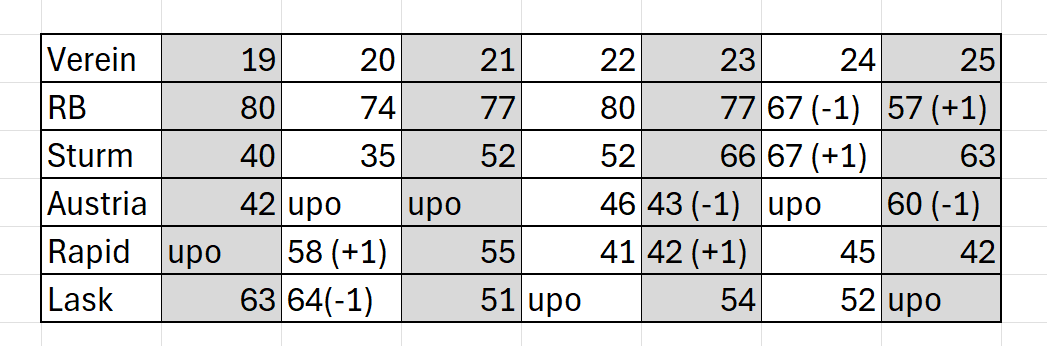 Gefühlt hätte ich gedacht, dass die Punkteteilung auf das Endergebnis mehr Auswirkungen gehabt hat. Wenn man es sich ausrechnet, war der Effekt deutlich geringer als gedacht (mir is klar das Spiele anders ausgegangen wären, wenn die Punkteteilung nicht da gewesen wäre). Zweimal hat Rapid um einen Platz besser abgeschnitten, einmal wir und einmal die Austria. RB hatte einmal einen Platz schlechter, die Austria zweimal. Hätte ich ganz anders eingeschätzt.