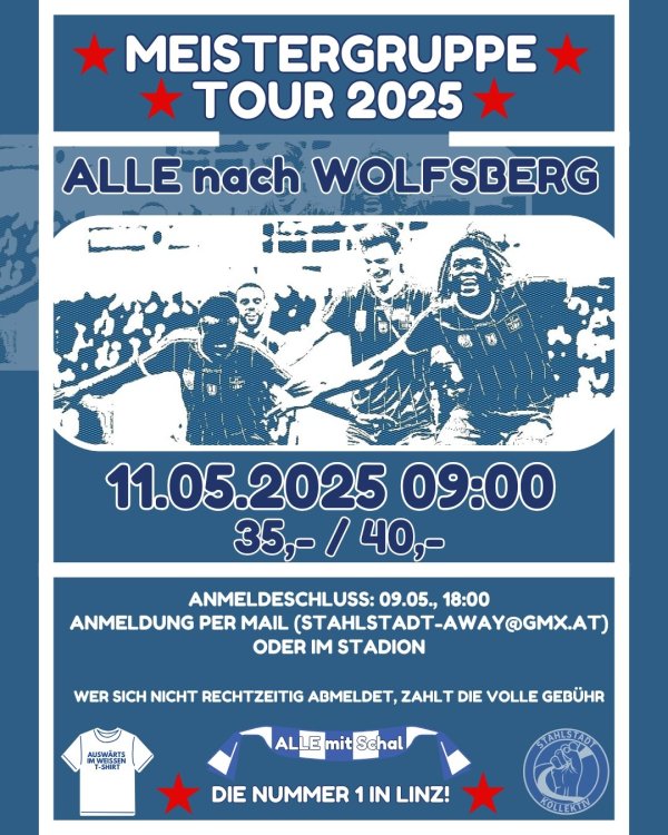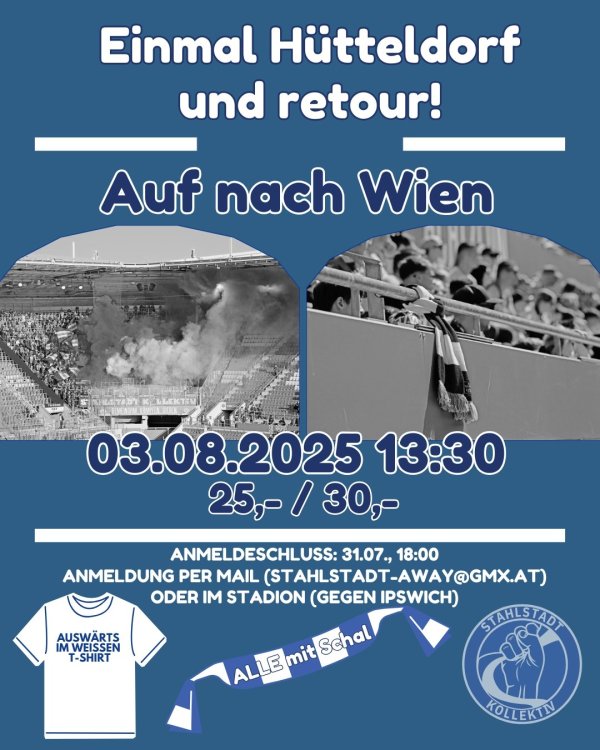 Unglaublich - das Stahlstadt Kollektiv organisiert Busse nach Wien. Ihr habt es euch schon fast gedacht, oder? Also los jetzt - anmelden zum letzten Auswärtsspiel der Saison. -
