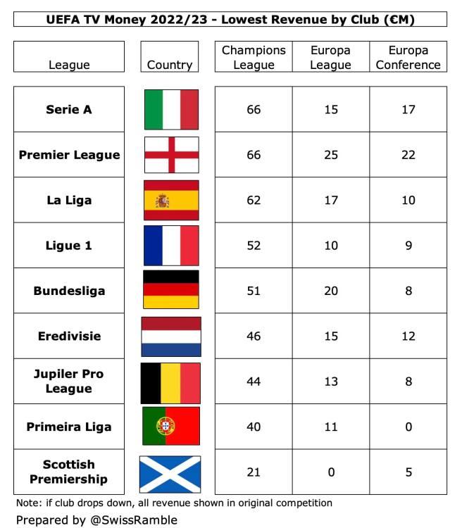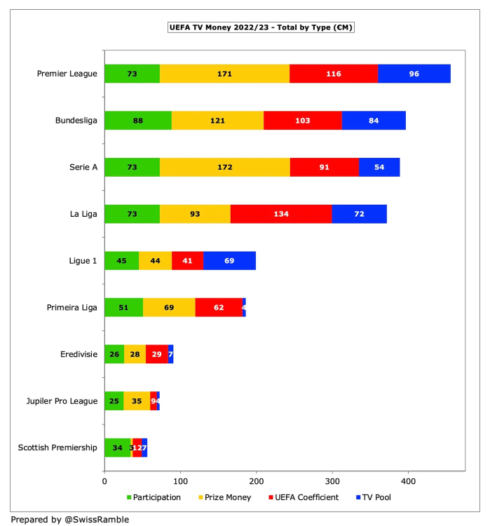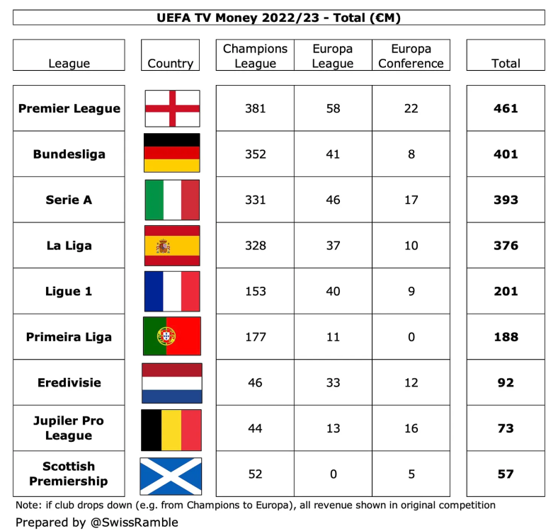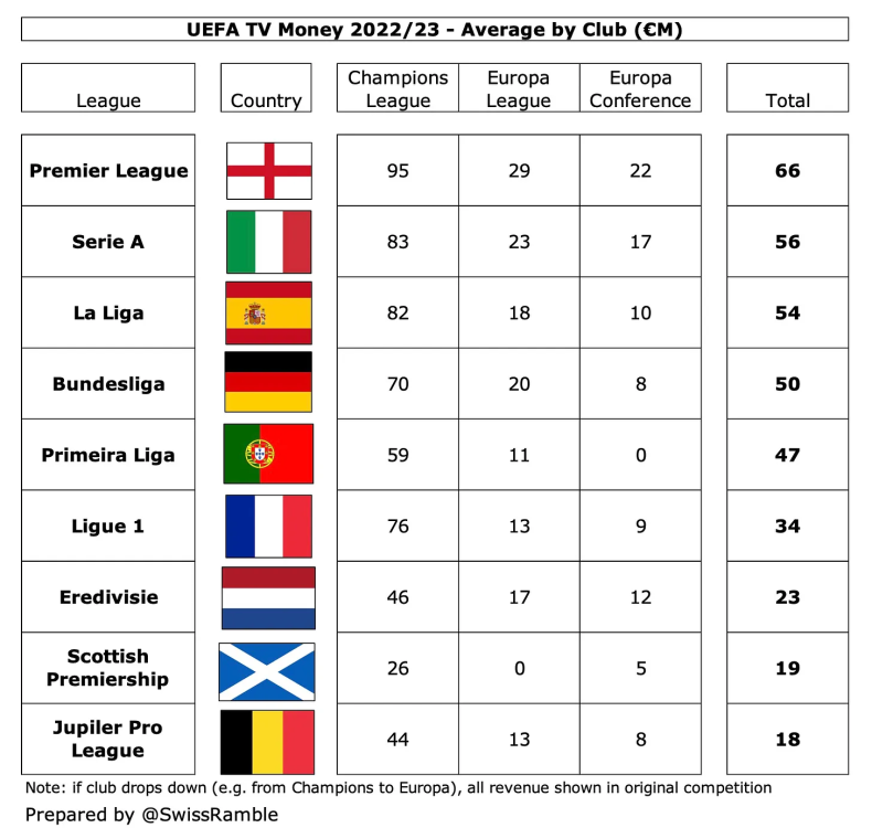 Highlights aus "UEFA TV Money 2022/23" - (c) swissramble Die Premier League hatte mit 461 Millionen Euro deutlich die höchsten TV-Einnahmen insgesamt, weit vor der Bundesliga mit 401 Millionen Euro, gefolgt von der Serie A mit 393 Millionen Euro. Für einige vielleicht überraschend, lag La Liga mit 376 Millionen Euro nach einer für ihre Verhältnisse mäßigen Saison nur auf dem vierten Platz, verdiente aber immer noch fast doppelt so viel wie die Ligue 1 mit 201 Millionen Euro. Die Bundesliga hatte mit 88 Millionen Euro die höchste "participation fee", der Grund dafür ist, dass Deutschland mit dem Sieg von Eintracht Frankfurt in der Europa League in der vergangenen Saison einen fünften Vertreter in der Champions League stellen konnte Vereine aus vier Ländern verdienten in allen drei UEFA Wettbewerben im Durchschnitt mehr als 50 Millionen Euro an Fernsehgeldern. Die Premier League lag mit 66 Millionen Euro (d. h. 461 Millionen Euro geteilt durch 7 Vereine) an der Spitze, gefolgt von der Serie A mit 56 Millionen Euro, der La Liga mit 54 Millionen Euro und der Bundesliga mit 50 Millionen Euro. Interessanterweise lagen die Durchschnittseinnahmen der portugiesischen Klubs mit 47 Millionen Euro um einiges höher als die der französischen Klubs mit 34 Millionen Euro, hauptsächlich, weil die Gesamteinnahmen nur auf vier von ihnen aufgeteilt wurden. Selbst die niedrigsten Beträge, die Clubs in der Champions League einspielten, waren signifikant und lagen bei drei von ihnen über 60 Millionen Euro, nämlich 66 Millionen Euro für Juventus (einschließlich 10 Millionen Euro nach dem Abstieg in die Europa League), 66 Millionen Euro für Tottenham Hotspur und 60 Millionen Euro für Atlético Madrid, obwohl zwei dieser Vereine es nicht schafften, aus ihrer Gruppe aufzusteigen. Marseille aus der Ligue 1 (52 Millionen Euro) verdiente mehr als Eintracht Frankfurt aus der Bundesliga (51 Millionen Euro), obwohl die deutsche Mannschaft das Achtelfinale erreichte, da Frankreichs großer TV-Pool nur auf zwei Vereine aufgeteilt ist.