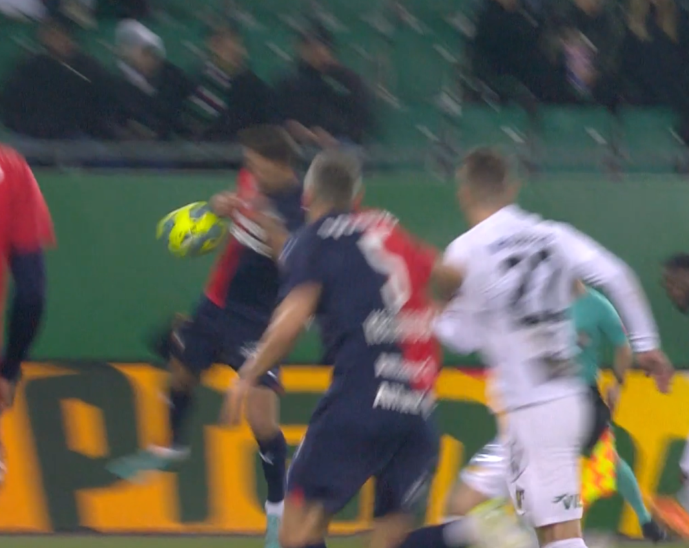 Was der VAR solange überprüft hat ist mir sowieso unklar. Das entscheidende ist die Frage "Handspiel?" und die ist eigentlich schon klar nein: Hofmann hat die Hand anliegen und dreht sich weg vom Ball. (Siehe Bild.) (Warum auch immer Hofmann nach der Berührung durch den Ball den Ellbogen ausfährt, das sieht komisch aus, hat aber nichts mehr mit der Frage nach dem Handspiel zu tun). Und damit ist die Frage: "Foul davor?" gar nicht mehr zu stellen. (Auch wenn das Foulspiel ebenfalls eindeutig ist aus meiner Sicht.)