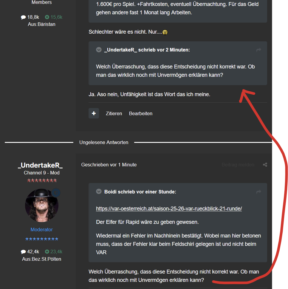 Objektiv gesehen gehen mir die Tanzgruppen bei Ecken alle am Oasch. Da würde ich mich sogar bei meinen Veilchen aufregen, wenn die so deppert sind. Vom 16er oder 11er mit Tempo aufs Tor oder andere Varianten. Aber ned dieses lächerliche Tormann blocken, als ob ma Rugby spielen wollte und nur zu wehleidig für den Sport ist. In der Situation hätte der Schiri vor dem Eckball abpfeifen müssen und die Spieler darauf hinweisen, dass er dieses Geplänkel nicht duldet. Wieder ein Problem in Österreich, dass bei so einer Situation unsere Pfeifen richtige Pfeifen sind. Dass der VAR und die Schiedsrichter allesamt in Ö zum Kübeln sind, das steht hingegen außer Frage.