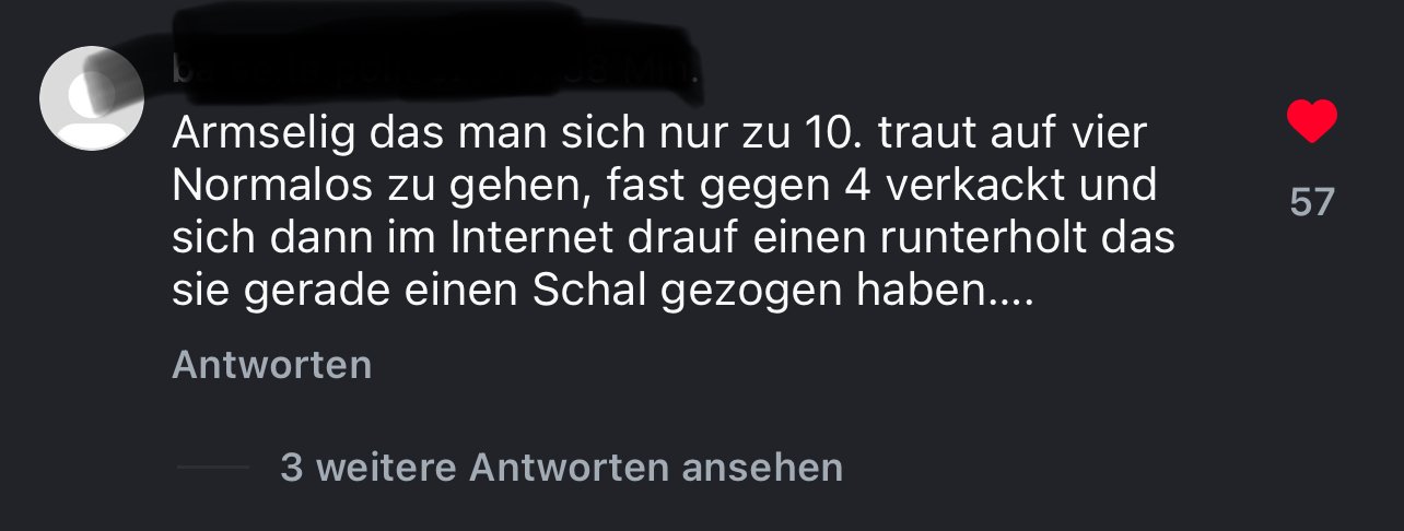 santaa1909 Posting-Pate Geschrieben vor 11 Stunden Normale Leute abziehen ist schon eine Kunst für sich und damit auf GruppaOF posen. Haben scheinbar Angst sich mit den richtigen zu messen nachm Spiel. 0 Zitieren Diesen Beitrag teilen Link zum Beitrag Auf anderen Seiten teilen More sharing options...