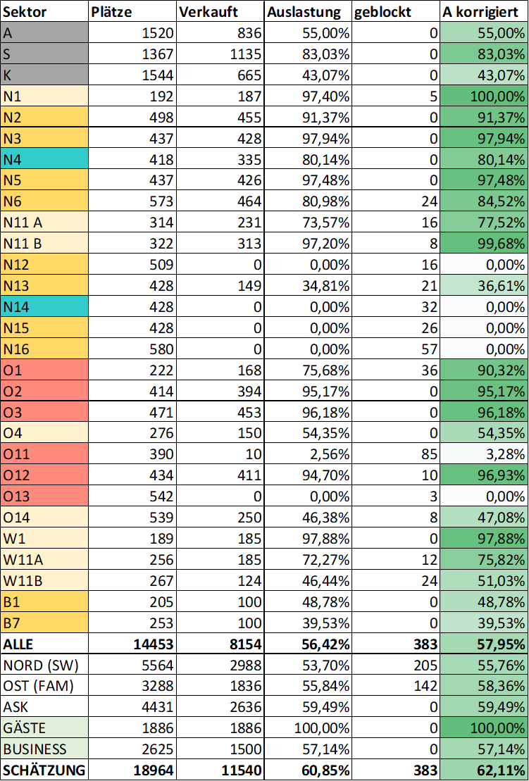 Traunseelaskler ASB-Legende Geschrieben vor 1 Stunde (bearbeitet) Update im Anschluss an den 11. Verkaufstag (11.4.): Sturm-Spiel: Spoiler In den letzten 24 Stunden wurden für diese Begegnung 445 Tickets verkauft. Davon entfallen 117 auf den Fansektor (A, S, K) 102 auf die Sitzplatzsektoren in der Kurve (N1, N11, W1, W11) 75 auf die Sitzplatzsektoren auf der Familientribüne (O1-O3, O11-O13) 151 auf die Sitzplatzsektoren auf der Längsseite (N2-N6, N12-N16) Cupfinale: Hier war der gestrige Verkaufstag gemächlich, es wurden insgesamt 71 Tickets verkauft, die sich folgendermaßen aufteilen: 26 im Altacher Fansektor - die Auslastung im Unterrang beträgt hier mittlerweile 97,22% 45 auf der Osttribüne (Auslastung: 92,04%) - aktuell gibt es hier 280 Tickets zu haben, insgesamt noch 916 Weil ich auf Social Media in der vergangenen Woche gelesen habe, dass die Westtribüne komplett durch Sponsoren ausgelastet sein wird - das kann ich mir nicht vorstellen, schließlich handelt es sich hierbei um 5880 Plätze. Zudem wurde auf einer Pressekonferenz beiläufig erwähnt, dass Sektoren auf der Westtribüne erst dann freigeschalten werden, wenn die Osttribüne so gut wie voll ist - was auch nicht viel Sinn machen würde, wenn es auf der Westtribüne gar keine frei verfügbaren Kontingente gäbe. Ich persönlich kann mir vorstellen, dass die Blöcke zwischen A2 und A9 für Sponsoren vorgesehen sind - sollten alle diese Bereiche belegt sein, handelt es sich um 3059 Plätze. Dazu kommen die 300 VIP-Plätze darüber. Trifft diese Annahme zu, dann würden insgesamt etwa 23 000 Plätze für das Cupfinale vergeben sein. bearbeitet vor 1 Stunde von Traunseelaskler 1 Zitieren Diesen Beitrag teilen Link zum Beitrag Auf anderen Seiten teilen More sharing options...