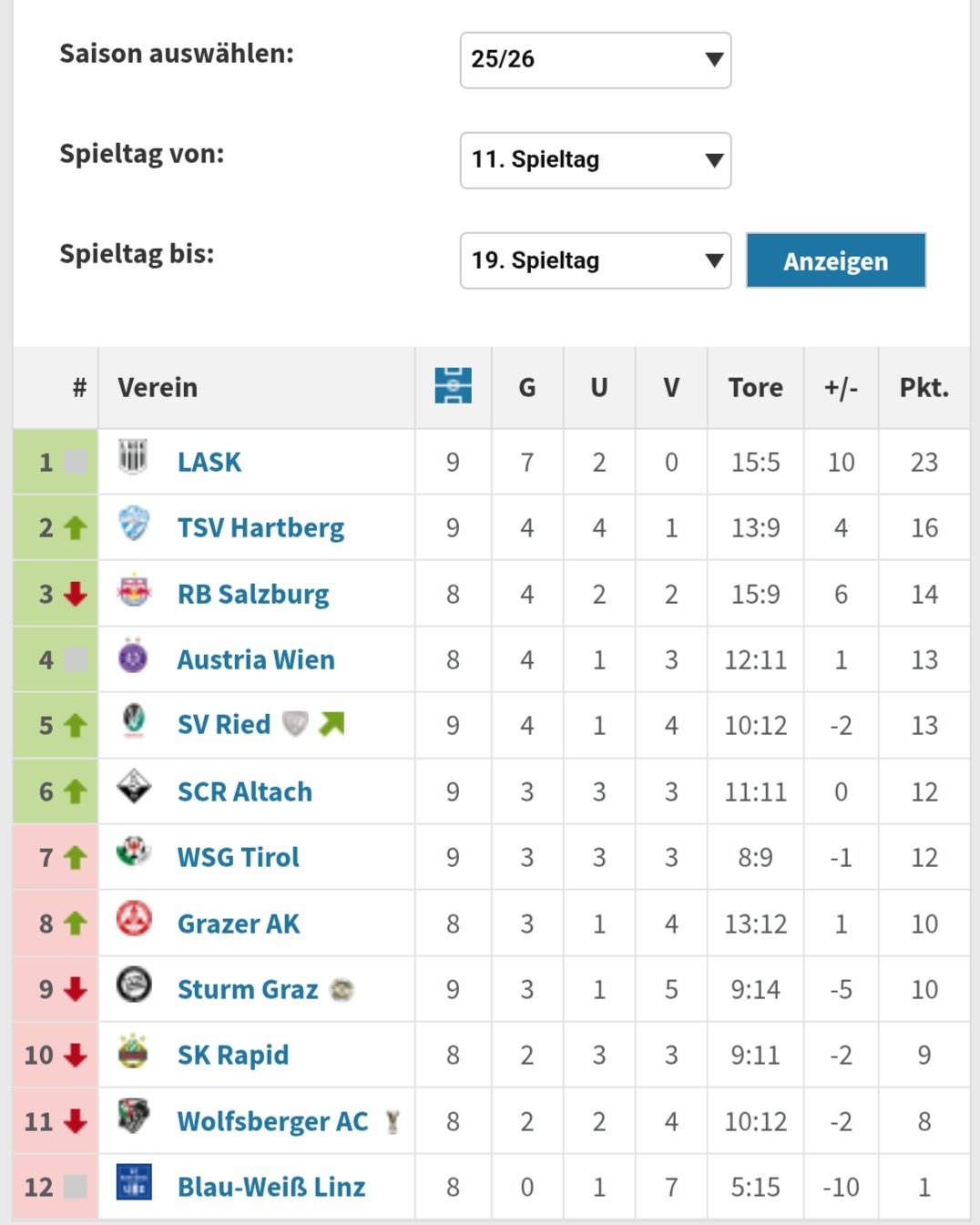 Feigling10 Postet viiiel zu viel Geschrieben vor 42 Minuten Casino Stadion schrieb vor einer Stunde: Die Tabelle sagt viel aus. Jetzt schon 8 Punkte Rückstand. Mit BW Linz abgeschlagen hinten drin. Gefühlt spielt jeder außer wir und Linz um die Top 6. Natürlich sagt die Tabelle viel wenn nicht alles aus aber ich sehe unser Hauptproblem in den vielen Gegentoren, vor allem bekommen wir zu viele leichte Gegentreffer. Teilweise habe ich das Gefühl, dass jeder noch so kleine Fehler bestraft wird und wir dadurch einfach zu wenig Punkte holen, wobei man schon auch sagen muss, dass wir wieder mal die ersten 10 Runden verschlafen haben, wäre interessant zu wissen wie die Tabelle ab der 11. Runde aussieht. Fakt ist sicher auch, dass wir uns jetzt endlich öfters belohnen müssen für den Aufwand den wir betreiben und das als Team, denn anders geht es eh nicht und da müssen wir bis zum Ende hellwach bleiben, denn sonst kommst da hinten einfach nicht raus. Wir sind im übrigen erst gestartet als uns die Freunde vom Jakomini mit dem Abstiegsgespenst überrascht haben und ein lustiger Fun Fact ist, dass Sturm als Tabellendritter gleich viele Niederlagen am Konto hat als wir, kannst echt nicht glauben wenn es nicht die Tabelle geben würde 4 Zitieren Diesen Beitrag teilen Link zum Beitrag Auf anderen Seiten teilen More sharing options...