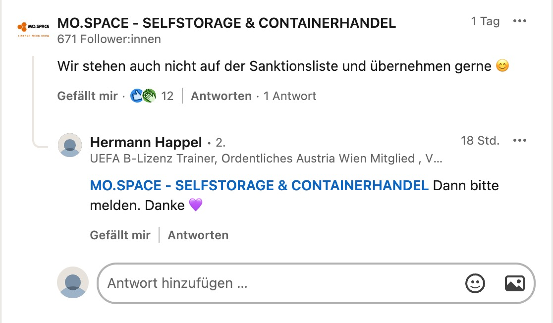systemoverload Kennt das ASB in und auswendig Geschrieben vor 3 Stunden Kommentar unter dem LinkedIn Post von der Austria zur Lukoil Auflösung https://www.linkedin.com/feed/update/urn:li:activity:7387038988936761344?commentUrn=urn%3Ali%3Acomment%3A(activity%3A7387038988936761344%2C7387059140348702720)&dashCommentUrn=urn%3Ali%3Afsd_comment%3A(7387059140348702720%2Curn%3Ali%3Aactivity%3A7387038988936761344) Nur ein ordentliches Mitglied antwortet, das keine Funktion bei der Austria hat. und dann auch nur "Dann bitte melden" nix vom Verein, nicht mal ein Like vom Verein. Ist schon ein Armutszeugnis, normal muss da öffentlich wirksam ein Kommentar hin, wo man gleich auf die zugeht mit netten Worten. Bin gespannt ob man die bald als CSR Partner sieht oder nicht. 10 Zitieren Diesen Beitrag teilen Link zum Beitrag Auf anderen Seiten teilen More sharing options...