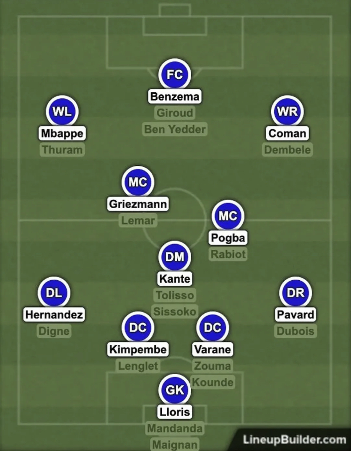 Sturm / Attaquants : Marcus Thuram, Kingsley Coman, Kylian Mbappé, Antoine Griezmann, Olivier Giroud, Karim Benzema, Wissam Ben Yedder et Ousmane Dembélé
