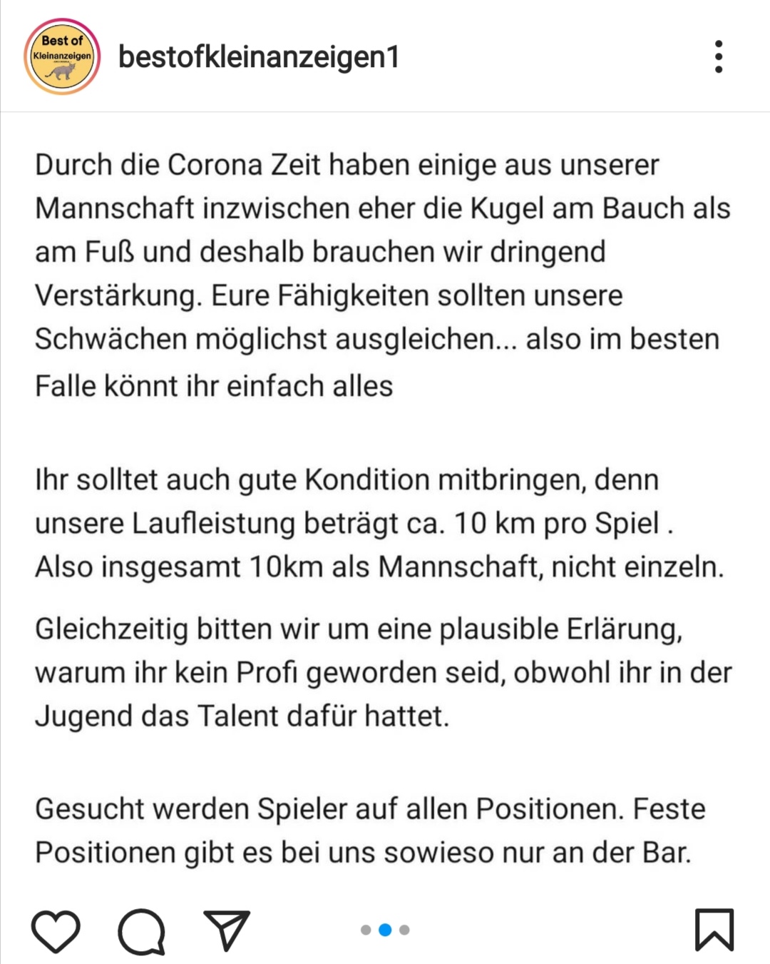 StopGlazer ***** Geschrieben 10. Juli 2021 diese annonce ist zwar scherzhaft zugespitzt, aber in etwa so hätten wir uns das umfeld in der 2. klasse ausmalen dürfen. diese ist die restlklasse des wr. fußballverbandes, umfasst nur mehr neun vereine in einem bewerb. noch vor wenigen jahren fungierte die mittlerweile aufgelassene 3. klasse als schutzklasse und wurde die 2. klasse in einem a- und b-bewerb geführt. o tempora o mores ? sagen wir alten deppen... 2 Diesen Beitrag teilen Link zum Beitrag Auf anderen Seiten teilen More sharing options...