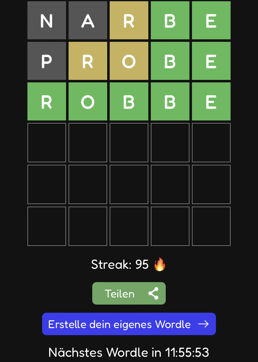 tirnweth Postinho Geschrieben 15. Oktober 2023 indestructable schrieb vor 36 Minuten: kacke. habs gestern früh nicht geschafft und dann tagsüber drauf vergessen Inhalt unsichtbar machen Wordle 848 4/6 🔥1 🟩🟨⬜⬜⬜ 🟩⬜⬜⬜🟩 🟩⬜⬜⬜🟩 🟩🟩🟩🟩🟩 wordle.at regal riese runde robbe Kenn ich, echt ärgerlich. Und heute mal wieder zu unüberlegt bei Quordle. Spoiler 1 Zitieren Diesen Beitrag teilen Link zum Beitrag Auf anderen Seiten teilen More sharing options...