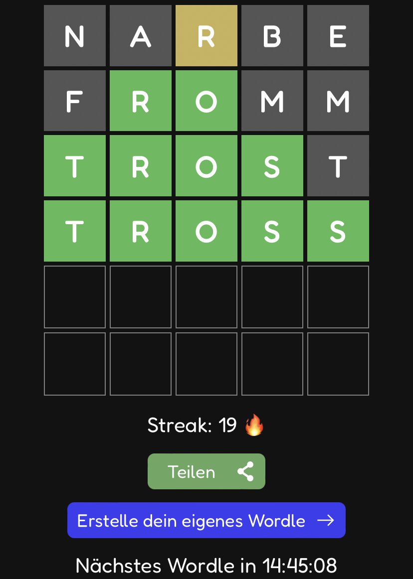 tirnweth Postinho Geschrieben 4. Februar 2024 Spoiler Tja, leider fürs falsche entschieden bei Quordle, hatte drei Möglichkeiten, ist dann halt auch Glücksache. 3 Zitieren Diesen Beitrag teilen Link zum Beitrag Auf anderen Seiten teilen More sharing options...
