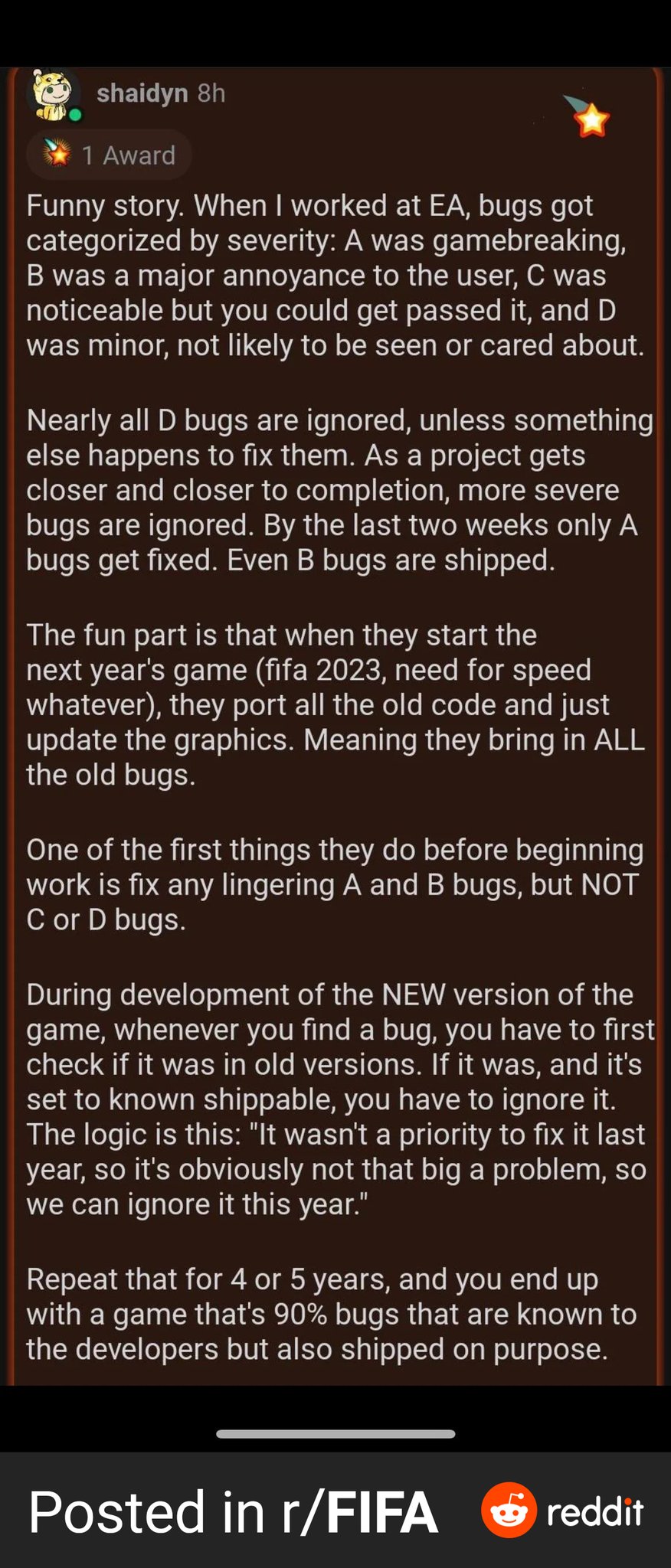 Batigol_7 ASB-Gott Geschrieben 22. August 2022 lovehateheRo schrieb am 20.8.2022 um 11:50 : Ich mein, das sind komplette Nonaned-Aussagen, und genau so läuft es in jeder Software-Entwicklung. Natürlich werden die Bugs nach Schwere kategorisiert und entsprechend abgearbeitet. da steht aber, dass gewisse Bugs gar nicht abgearbeitet werden und einfach immer wieder weitergeschleppt werden und nicht,weil sie die Kohle oder Kapazitäten dafür nicht hätten, sondern weil es ihnen einfach egal ist 0 Zitieren Diesen Beitrag teilen Link zum Beitrag Auf anderen Seiten teilen More sharing options...