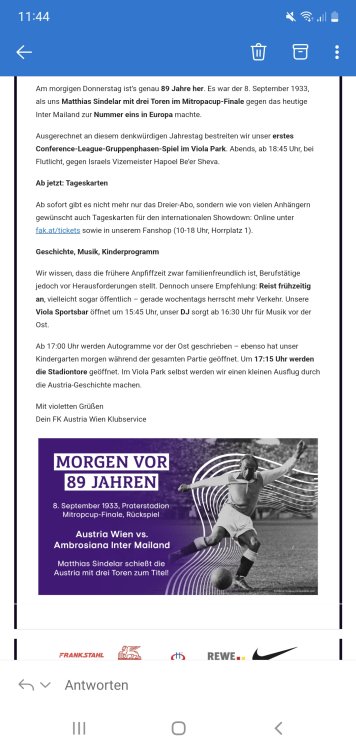 flowbert Teamspieler Geschrieben 7. September 2022 PK 7.9.2022 Zusammenfassung mit Manfred Schmid und Reinhold Ranftl MS große Vorfreude, riesige Herausforderung, ‚Europacup als Belohnung für Mannschaft/Trainerteam. RR Vorfreude aufs erste Match MS: An Defensivverhalten wird gearbeitet. Spielbeobachtung vor Ort von Beer Sheava durch Informanten, ist ein zweikampfstarkes Team. Es ist ihm egal, ob Beer Sheva in der Meisterschaft performt. MS: Personelles Update: El Sheiwi Entwicklung erfreulich, braucht noch Zeit, Huskovic hat erstes Training mit der Mannschaft gemacht. Generell entwickeln sich Spieler gut weiter – Motz wird hervor gehoben, Vorfreude der Spieler/Club groß. RR: Wir wollen das Spiel gewinnen, ja, zweikampfstarkes und -hartes team, fußballerisch brauchen wir uns nicht verstecken. MS: Es geht um die ersten zwei Runden, damit wir eine Chance auf den 2. Platz haben. Guter Start ist notwendig. RR: Frage an ihn zu: Unterschied LASK/Austria hinsichtlich Medieninteresse? Schwierig zu beantworten. Für Conference League Performance ist ein guter Start wichtig. 4 Diesen Beitrag teilen Link zum Beitrag Auf anderen Seiten teilen More sharing options...